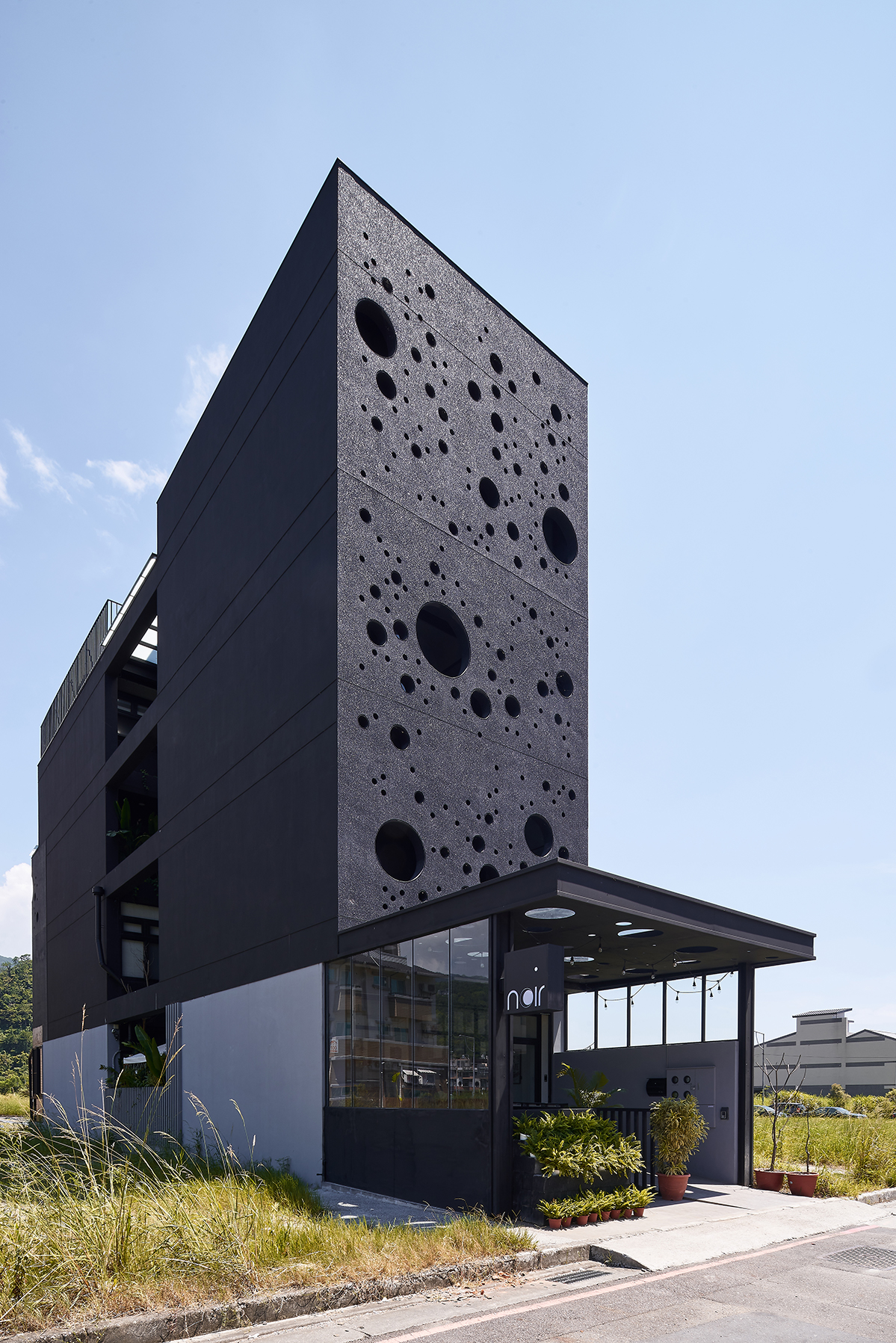 頭城烏石港海浪的鹹味、烏黑油亮的沙灘、龜山島,是我們對這裡的第一印象,把對這片浪花拍打在礁石上的泡沫意象 轉化成民宿建築的空間設計元素。黑色牆面的密布的開孔,日間讓光束漫進室內彷彿白色的氣泡緩緩游移;夜晚建築則幻化成一盞神秘的黑色燈籠,淡淡黃光從黝黑的大石塊中散出,暖了旅人的心……