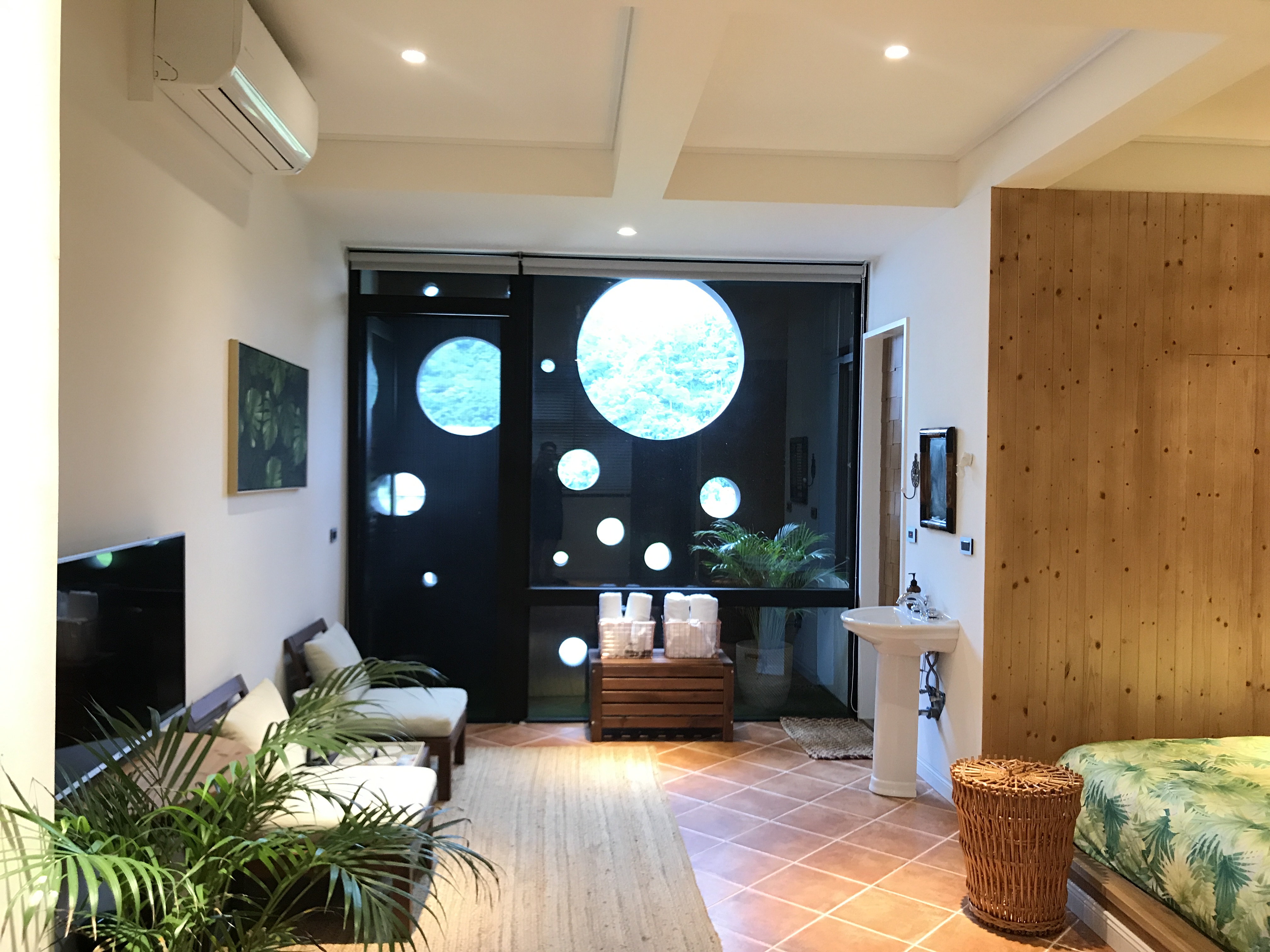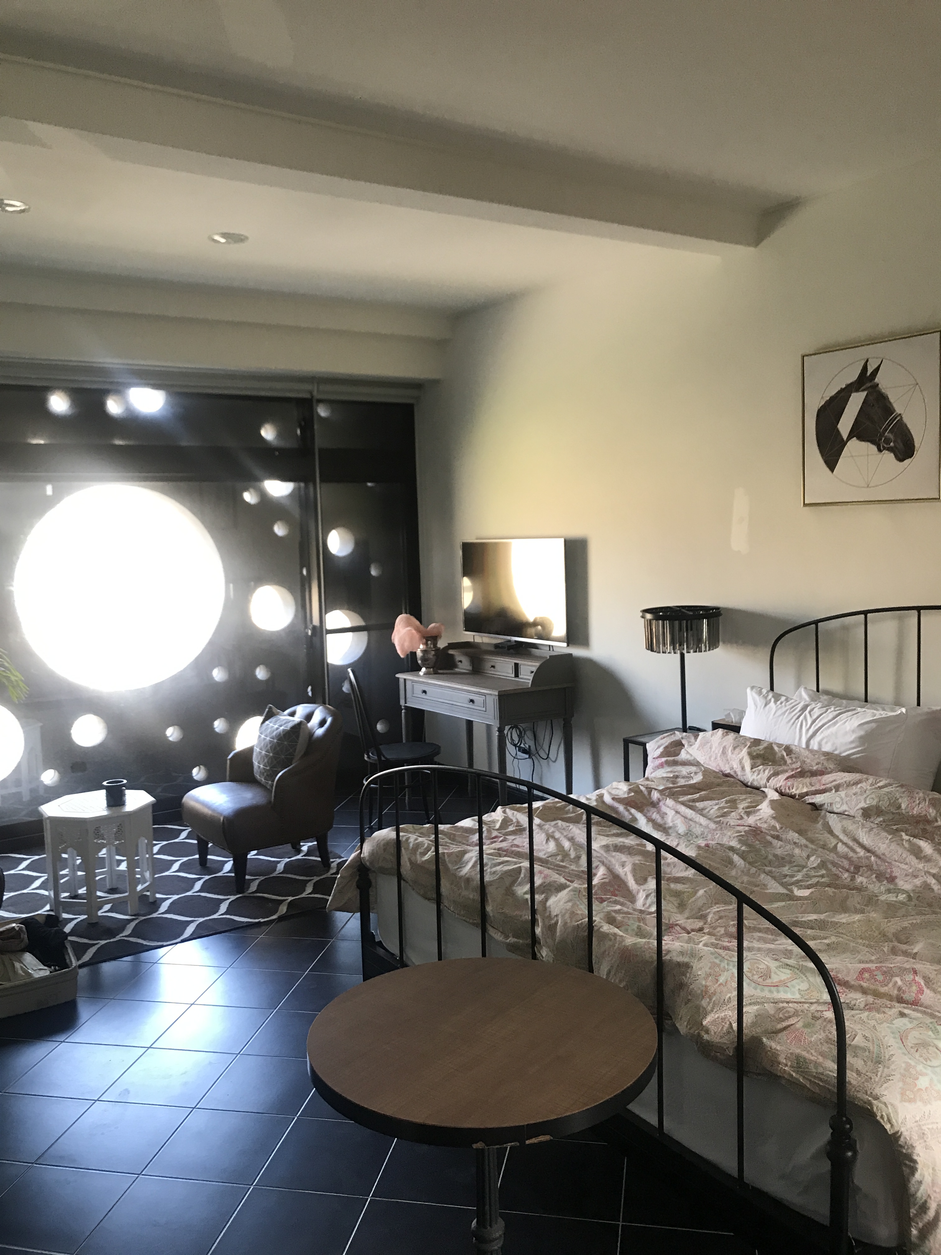 客房內,大大小小的圓點光牆,過濾了街道的繁雜,只留下一抹一抹寧靜的框景。