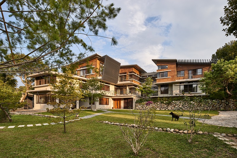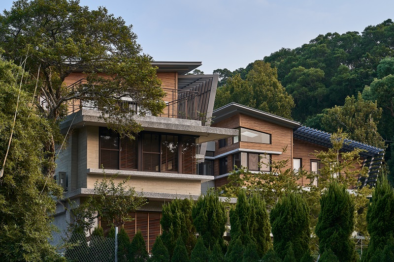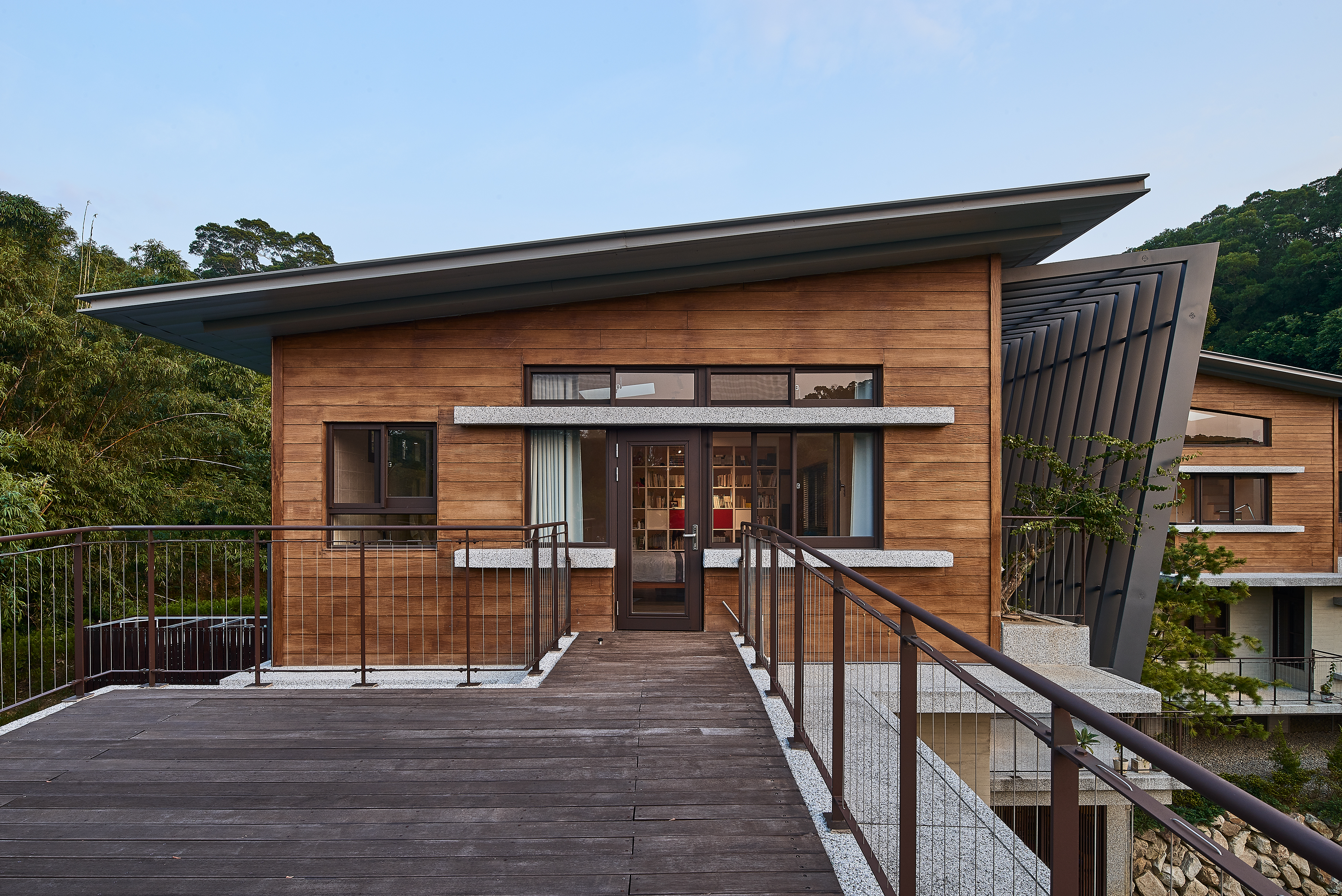 本案採L型配置,使每個居室都能看到基地內的精神象徵__百年老樹,並有良好通風採光。 為降低建築物在山林的量體感,透過三個屋頂造型碎化量體,形成三棟山林小屋之意象。