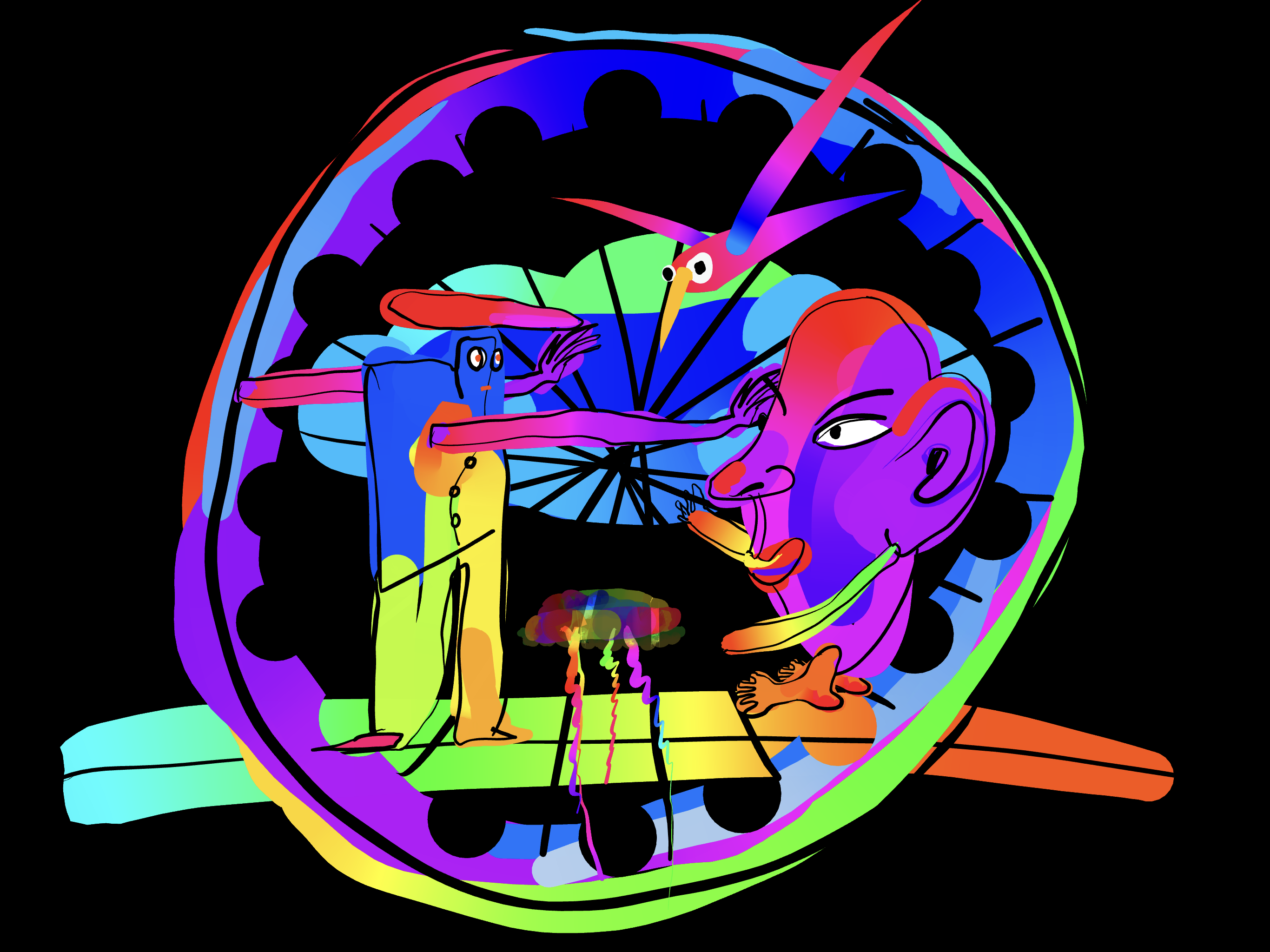 Every evening the residents of my neighborhood (3 streets in the 18th arrondissement of Paris) can enjoy my visual creations projected in 7m x 5m. Many of them are caregivers from Bichat Hospital. It's my way of supporting their hard work on a daily basis during the pandemic. It is also a way to awaken the creativity of my neighbors, a kind of visual poetic pedagogy. Here we see both the artist in full creative fever, and the human being pursued by the science and the viruses that he helped create.