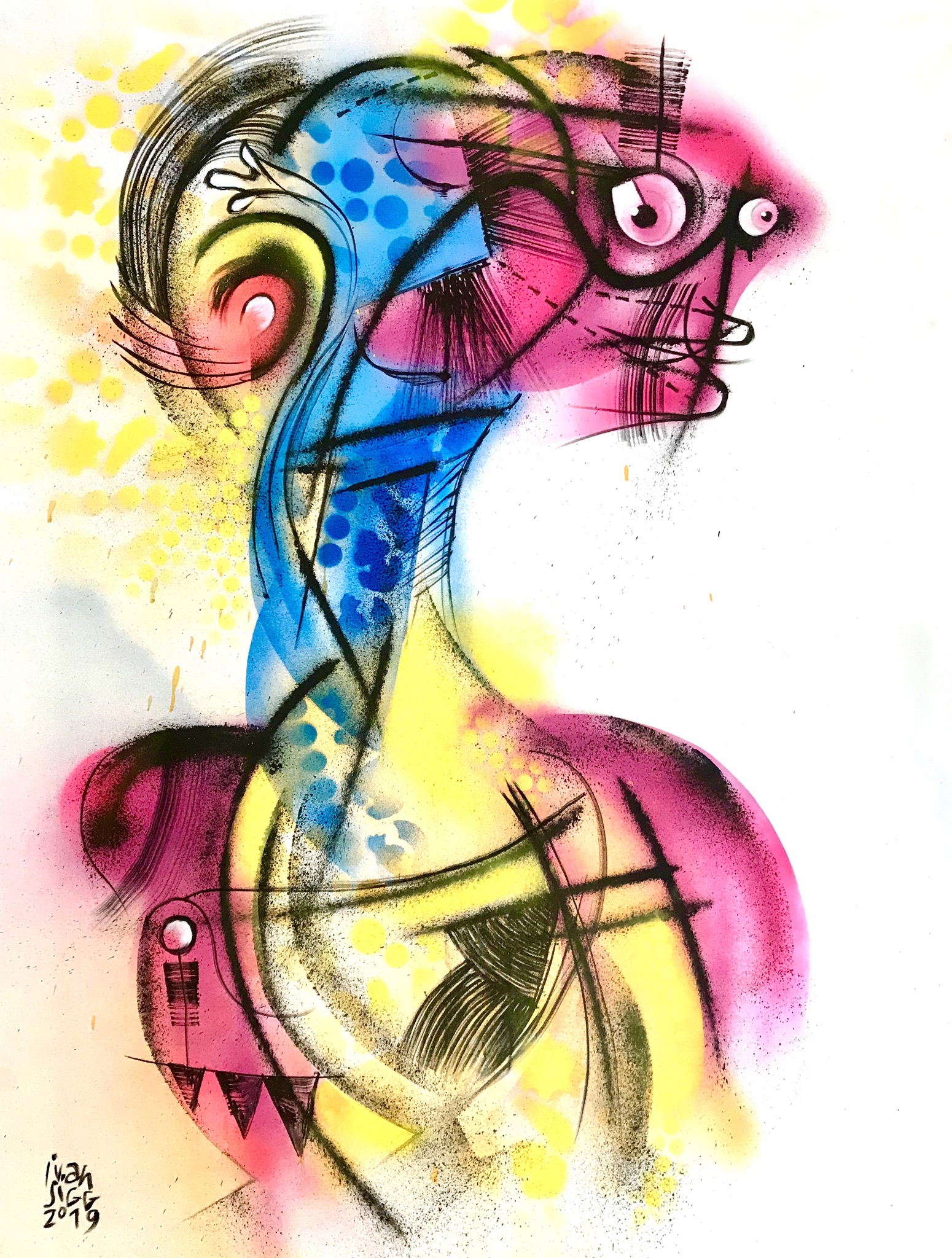 除了光影畫,今天繼續用街頭藝術工具(噴繪和標記)繪畫對我來說很重要,因為它們涉及非常豐富的手勢、能量和材料。我真的很喜歡這個自畫像的暈色、噴射、 擴散及高彩度。