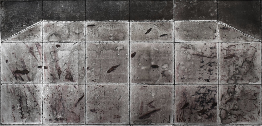 ▲侵蝕的記憶-家12 Rusty Memory -Home12 62X29.5cm 紙本、墨水、鋁箔、線 2016