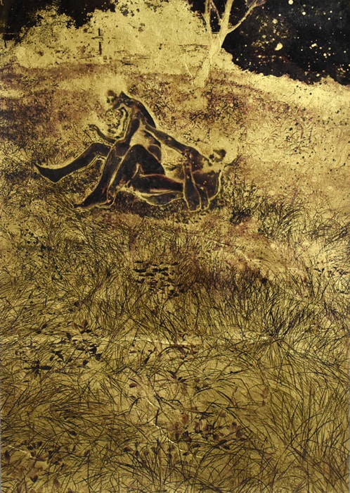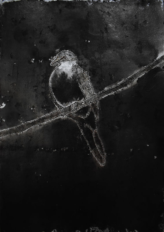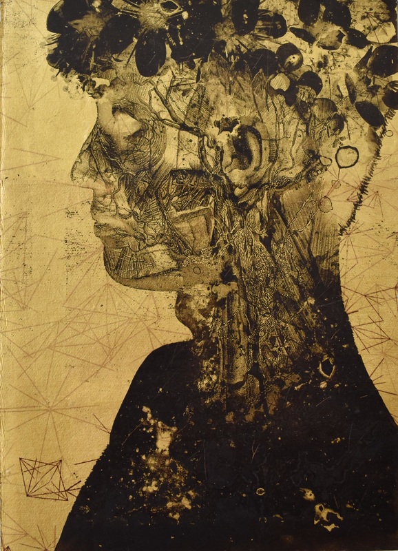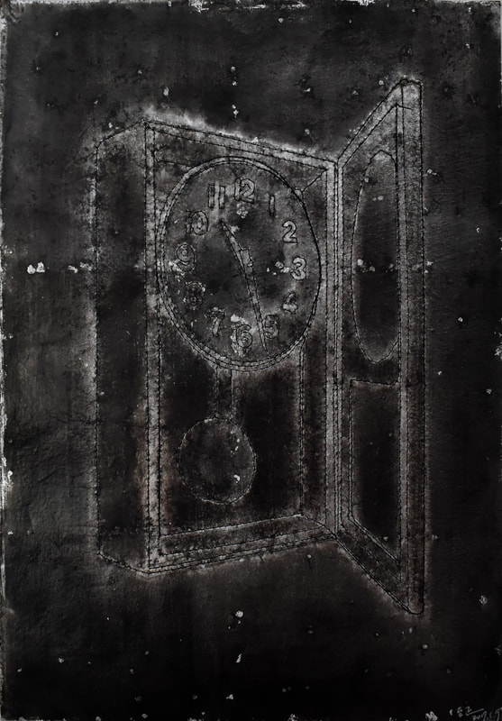 我依序運用了轉印、縫線、水墨等複合媒材,完成一件作品,而在最後的水墨階段時,我視作品為版畫的印版,進行單版印製,由於水墨濃厚之故,這樣的印製只能有一次機會,印製後的版畫與作品兩者都是創作的結果,而版畫卻又更近似於初初作品進行轉印時的模樣,彷彿在作品與版畫之間存在著輪迴。