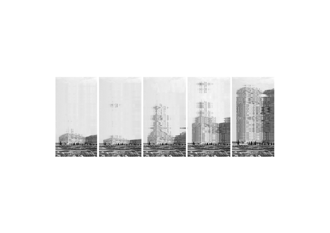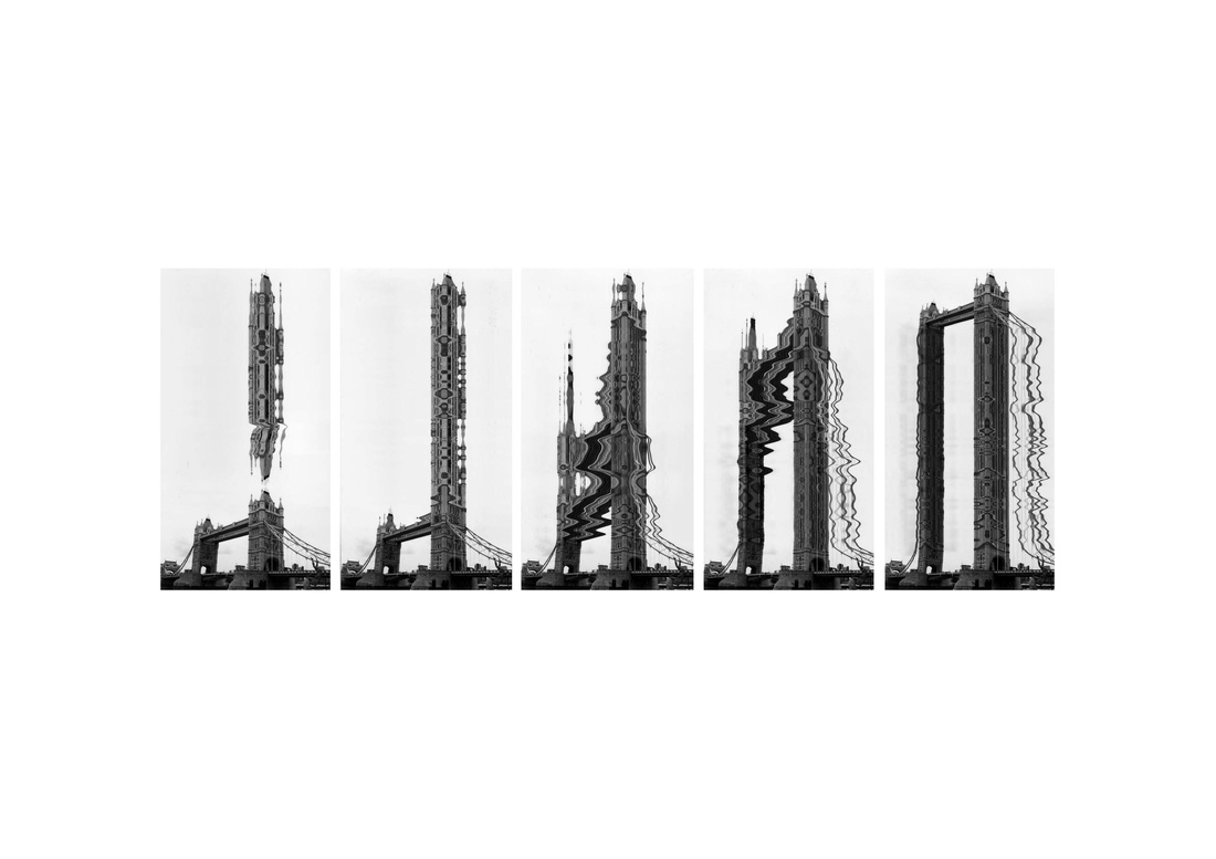 照片和掃描器所產生的波紋,令我著迷。當我們接觸相紙時,微微的輕撫和觸摸,在「掃描」的過程中放大其中的感受,將畫面的波動視為一種能量,無論是聲波、音波、電波、或帶有某種情緒的振幅 ,在漸變的建築中,改變並呈現另一種面貌,刻意拉長或增大建築的比例,從原本固有的立體建築,到平面的延伸,產生節奏變化和時間感 ,而那看似多變的建築風景,想像因此蔓延。