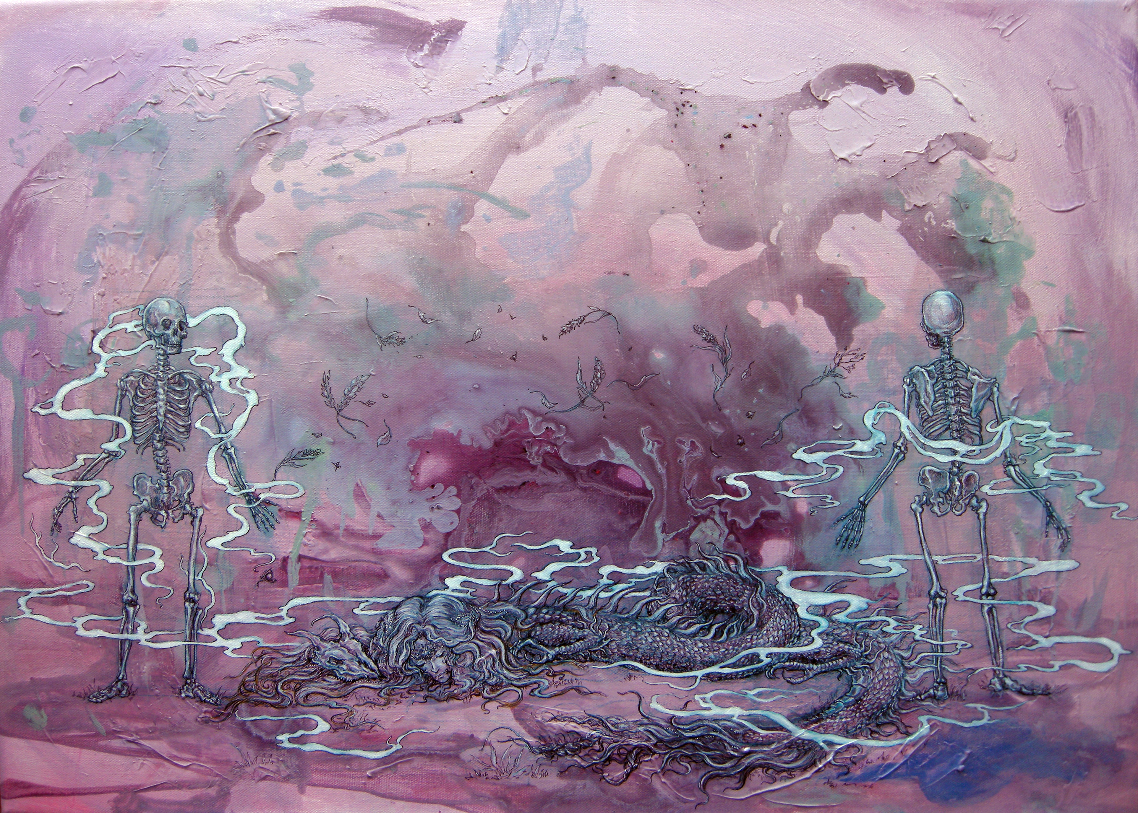 在「祭品 I」 山神正要吃掉這隻山羊,但山羊並不知道自己已身陷危機,還悠哉地吃著草。這畫面有呼應英國Pre-Raphaelites畫派的作品 。例如: 在那畫派的作品中緊張和危險的情緒是不會表達在畫面中的,因為當時Pre-Raphaelites畫派注重的是唯美的感覺;而在 「森林中睡午覺」 裡我描述的是山神享用完祭品後在森林裡午睡的畫面。一對仿佛門神的骷髏正守護著山神,而這畫面我想表達的是人民對宗教神祇的崇拜。