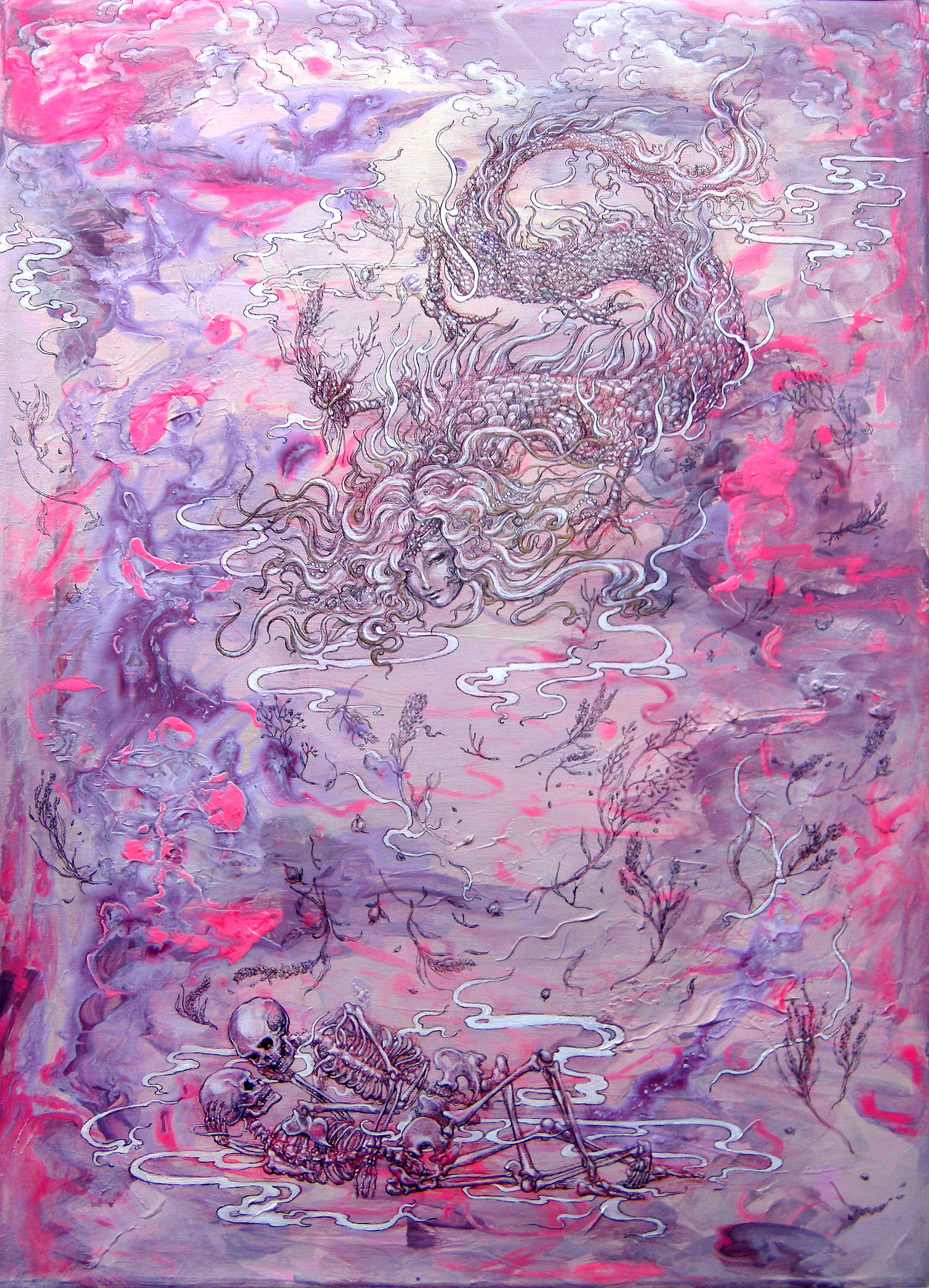 希臘神話透過這樣的反諷傳遞故事的寓意—雅典娜將美杜莎變成被稱為戈爾貢的蛇髮女妖,人類只要看一眼這種極為恐佈的怪物便會化為石頭,女妖的蛇髮經常代表生命的循環,也呼應我創作中銜尾蛇的主題,美杜莎同時也象徵對女性身體的壓迫與自由,社會要求女性要令人渴望又貞潔有德、保有處子之身卻又放蕩不羈,而美杜莎臉上的繩索元素是日本緊縛傳統的形式轉化,也同樣強調這點。