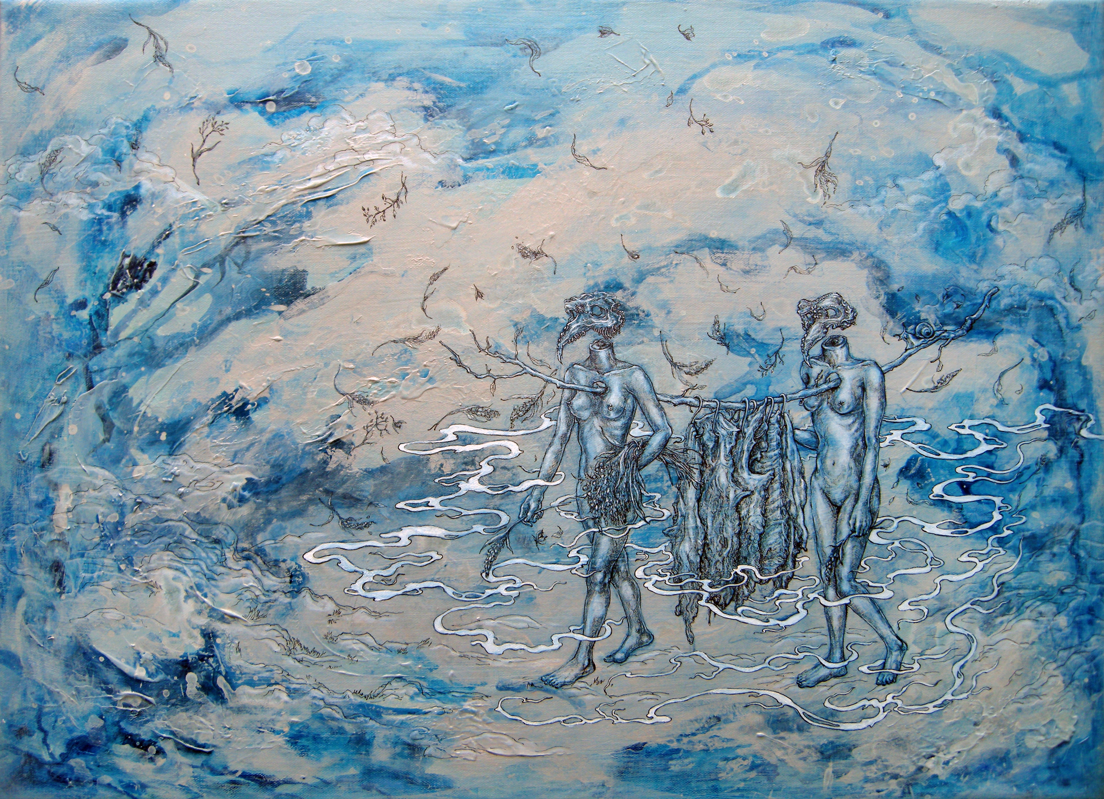 在 「祭品 2」 裏我描繪了山海經裡的貫胸國人運送貢品給山神的過程。 貫胸國人是「山海經」裡的怪物種類之一,貫胸國人胸口的洞來自戰爭後,受仙人塞藥草而造成的,我自行改造了貫胸國人。在原書中,他們是有頭有臉的,體型偏男性,我把它們改造成女人的身體,而且把頭砍掉 (象徵人為了堅持正義或某種熱愛而犧牲自己,把頭改成華麗的威尼斯黑死病醫生面具(象徵無自我和保護自己的護身符)