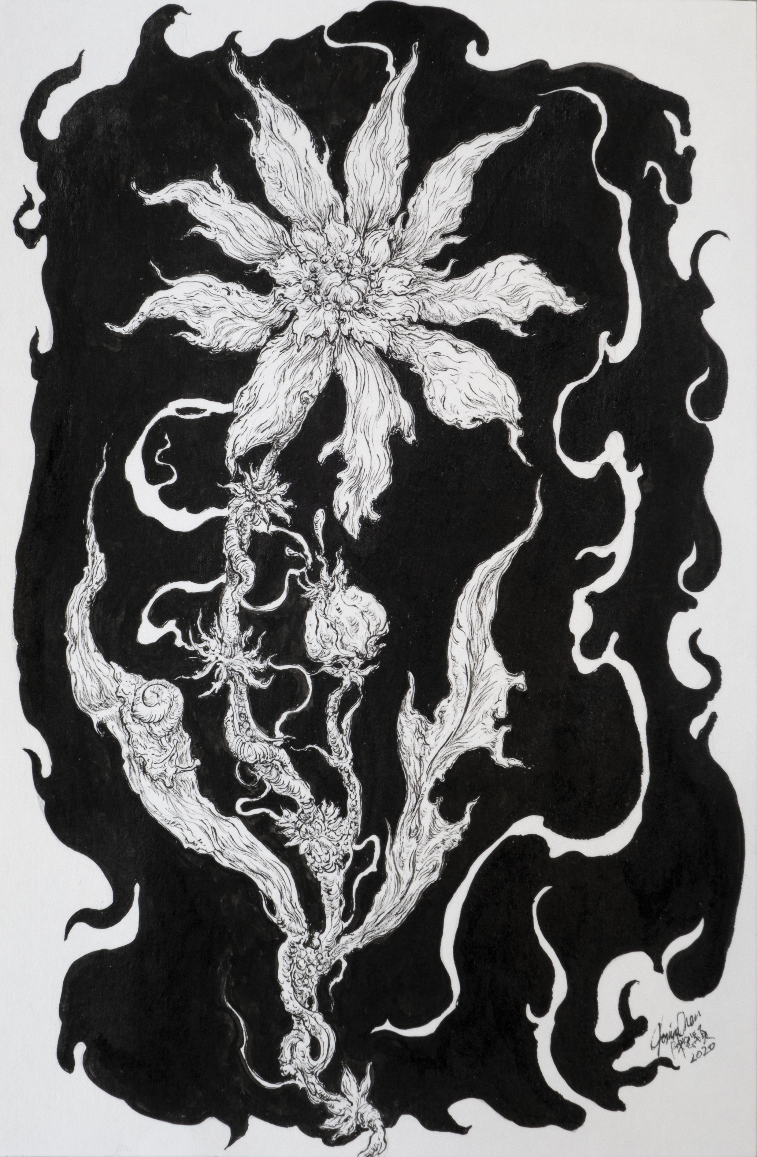 我自從 2018年受邀到美國聖路易駐村經驗,我就發表了去年在采泥畫廊展出的四照花系列。(我把四照花聯想成一顆生命之樹)。但我這次畫得是我想像的一朵花,細節靈感來自於我喜愛的巴洛克/洛可可圖騰設計。