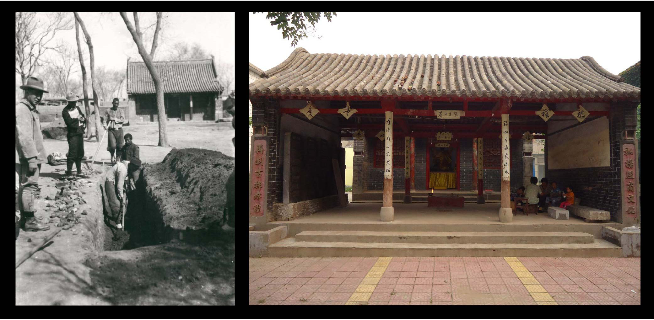 左圖為 1932 年史語所考古人員在五聖廟前的發掘,右圖為 2018 年王舒俐攝於五聖廟。