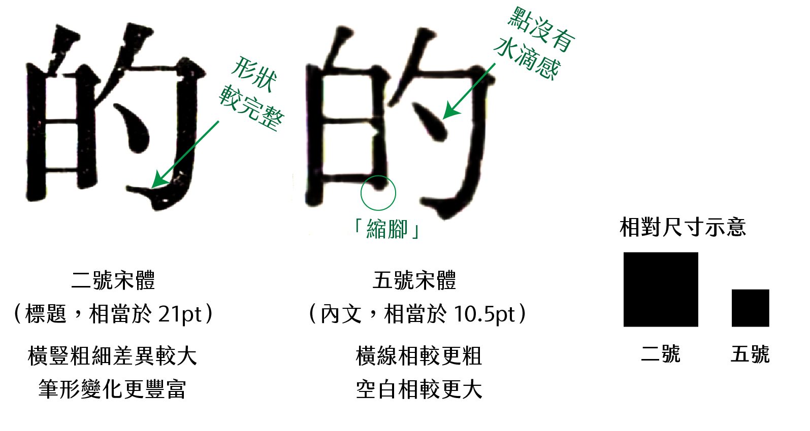 固然大字較粗,小字較細。然而大字更有表現細節的空間。以「的」字為例,其中「勺」的點在二號宋體被刻出完整的水滴造型。而較小的五號宋體的點就沒這麼有變化。這不是刻字師傅到小字時忽然偷懶了。而是這個完整的水滴造型在 10.5pt 的內文尺寸上,實在沒什麼太大的意義。