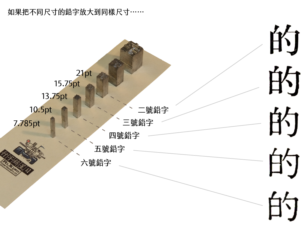 把字型自由的放大縮小,現在是一個連小學生都會的事情。只需要點開下拉選單,選擇一個想要的數字就可以了。但在鉛字時代,字型實際的應用大小正好就是它被刻出來的大小。工匠師傅們不用擔心字被放大後反而不合適的問題。