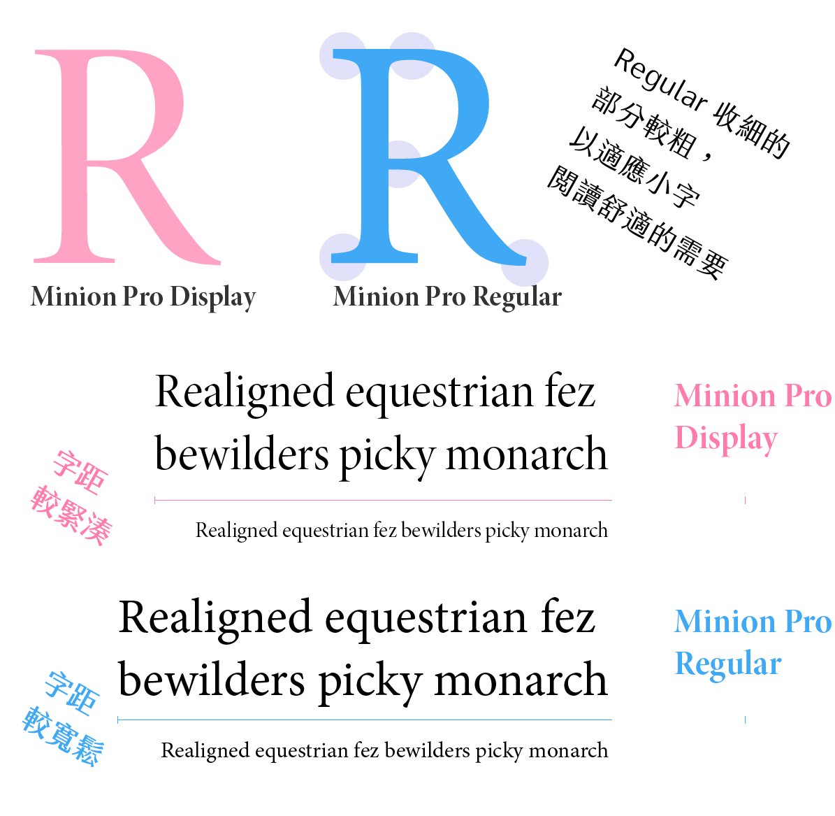 透過下圖的比較,我們可以發現有明顯的設計差異。Minion Display 透過更鮮明的粗細對比創造出個性,需要在一定的尺寸以上使用,才最有效果。