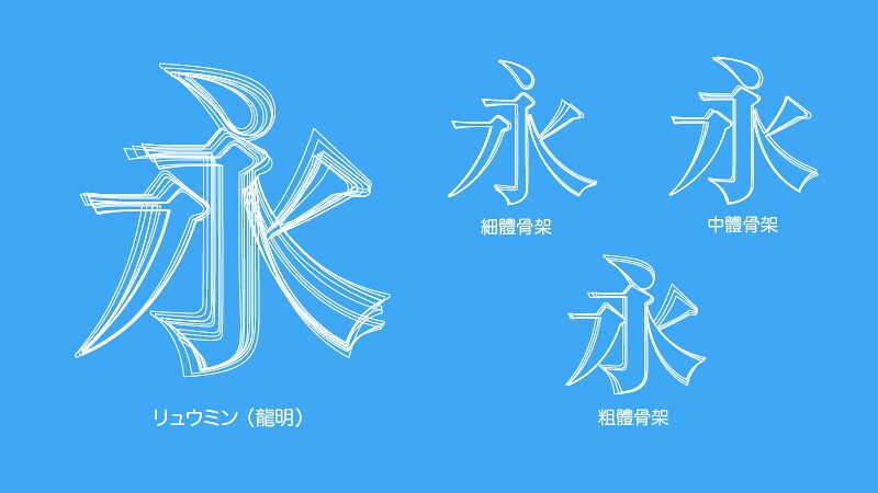 而另一些字型家族雖然在產品規劃上沒有以視覺尺寸來區分,但也納入了這個概念來設計。例如森澤「龍明」家族在不同粗細,有不同的骨架設計,沒有一體適用。或許是因為「龍明」源自鉛字,鉛字原本就有不同的視覺尺寸,而設計團隊沒有捨棄這個特徵。