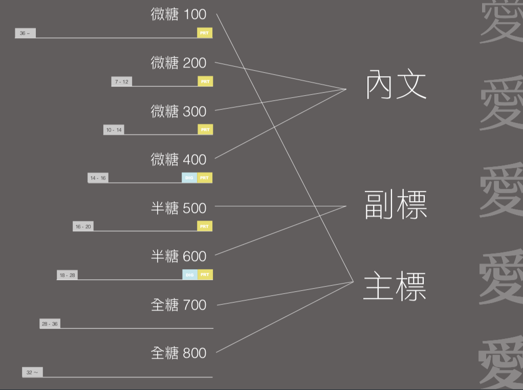 柯熾堅設計信黑體時也考量到這點,沒有把單一骨架套用於所有家族成員上。而 justfont 針對金萱家族,也有一份考量到視覺尺寸的應用建議。字型總監林霞也在〈抓蟲記〉一文中說明了為何金萱粗體字的骨架設計不同於細字。