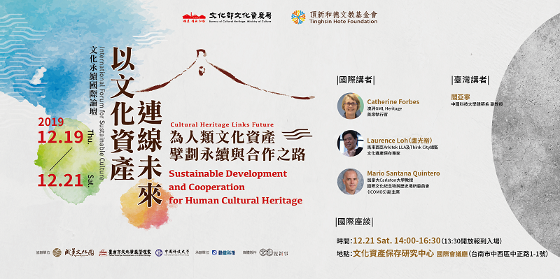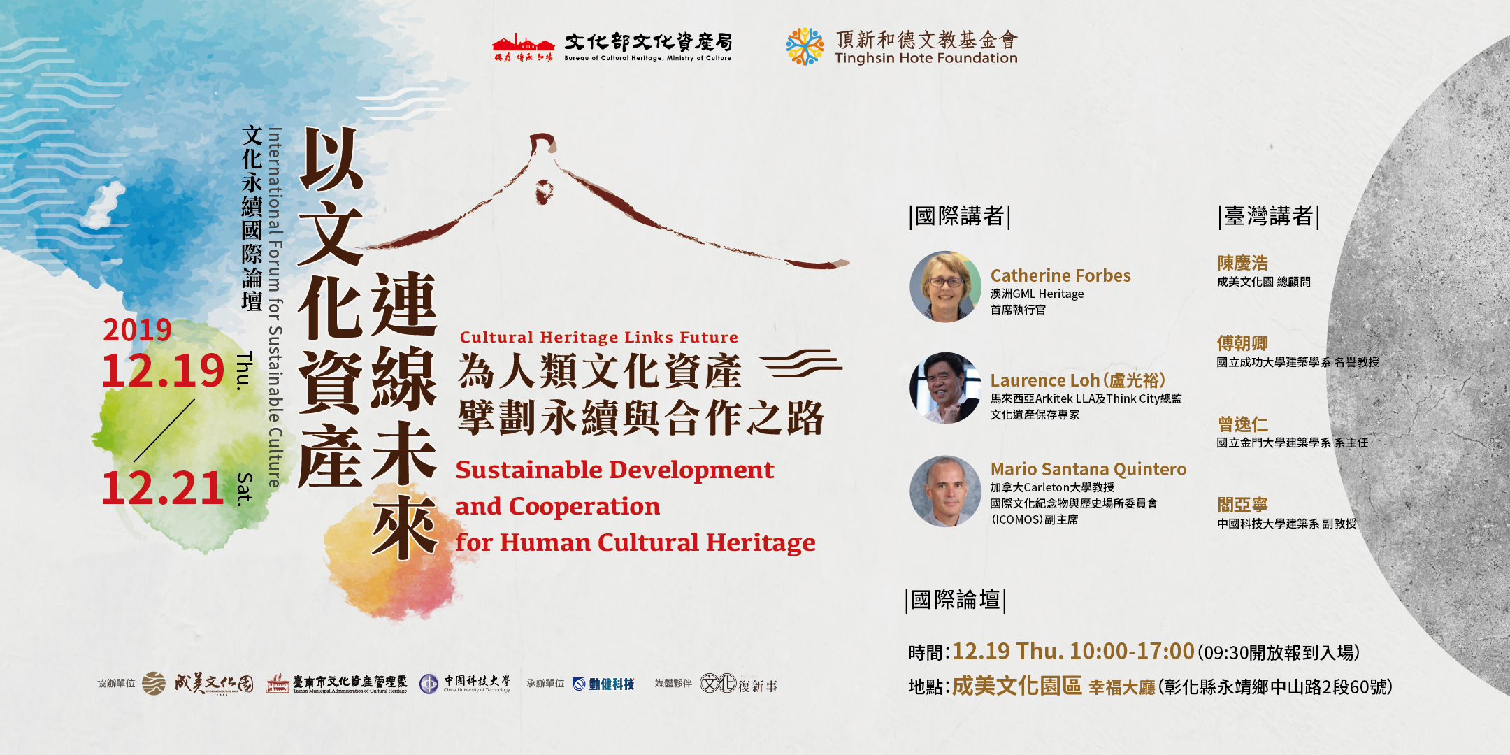 「文化永續。國際論壇」冀盼拉高我們的視野格局,邀請文化資產保存領域的國際級領袖蒞臨台灣, 分享世界趨勢與各地經驗觀點,並進一步與台灣專家領袖的研討交流,藉以創造國際合作契機、發展台灣文化保存策略,為文化台灣永續盡一份心力。