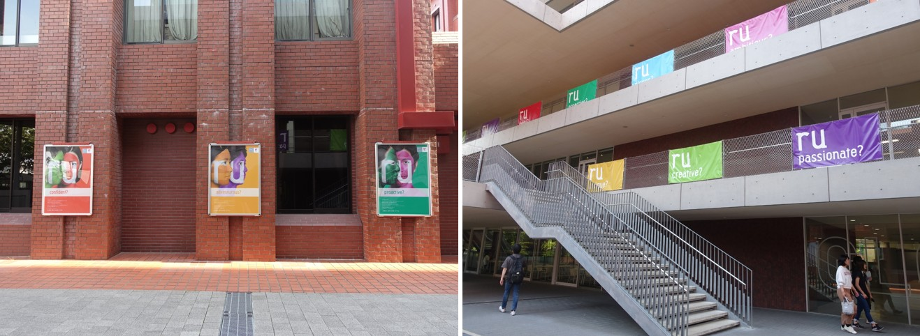 位於京都的龍谷大學,其創設最早可追溯至1639年,前身是由西本願寺所設立培養僧侶的教育機構,時至今日已成為日本著名的私立綜合大學。在這所歷史悠久的學校中,處處可見「You, Unlimited」的Slogan,校舍上飄揚的各色旗幟或海報,斗大的「ru (are you)」嵌印其上,不斷探詢學生是否具有主動的、冒險的、創造的、自信的、熱情的……種種不受限的特質。
