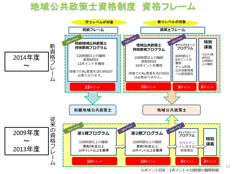 白石教授表示「地域公共政策士」制度參考「歐盟資歷架構」(European Qualifications Framework ,EQF)訂立能力指標,將資格取得者的學力程度設定為八個級別。目前在各大學開設的學程和相應的授予資格,可區分成「初級地域公共政策士」(第六級)與進階的「地域公共政策士」(第七級)二種,前者在大學階段取得,後者需要在研究所(碩士班)階段才能取得。未來也規劃將此一制度往高中職階段延伸,讓高中生能取得四級的「地域公共政策士」制度資格。