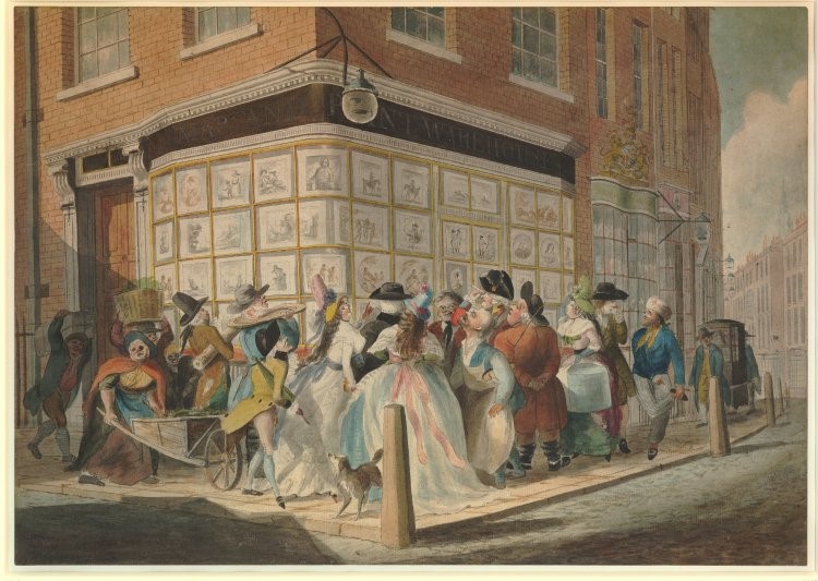 18、19世紀的歐洲版畫就像今天的電視節目或電腦網路,扮演了傳播新聞、教育知識、政府政策、民間想法,以及娛樂大眾的角色,有時也帶有煽動毀謗等負面作用。在法國大革命的時代,版畫用看似輕鬆與嘲笑的手法,反映了民間各種疑慮不安的情緒,還有更多的是人與社會的變革。隔著狹窄英吉利海峽的英國也是如此,倫敦都會更是版畫店的群聚之地。18、19世紀之交,倫敦著名的版畫店如泰晤士河畔皇家藝術學院(Royal Academy of Arts, Somerset House)旁邊,就有來自德國的書商與出版商魯道夫‧雅克曼(Rudolph Ackermann, 1764-1834)開設的大型版畫與畫具供應店,[1*]對當時藝術的影響和教育功能不言而喻。