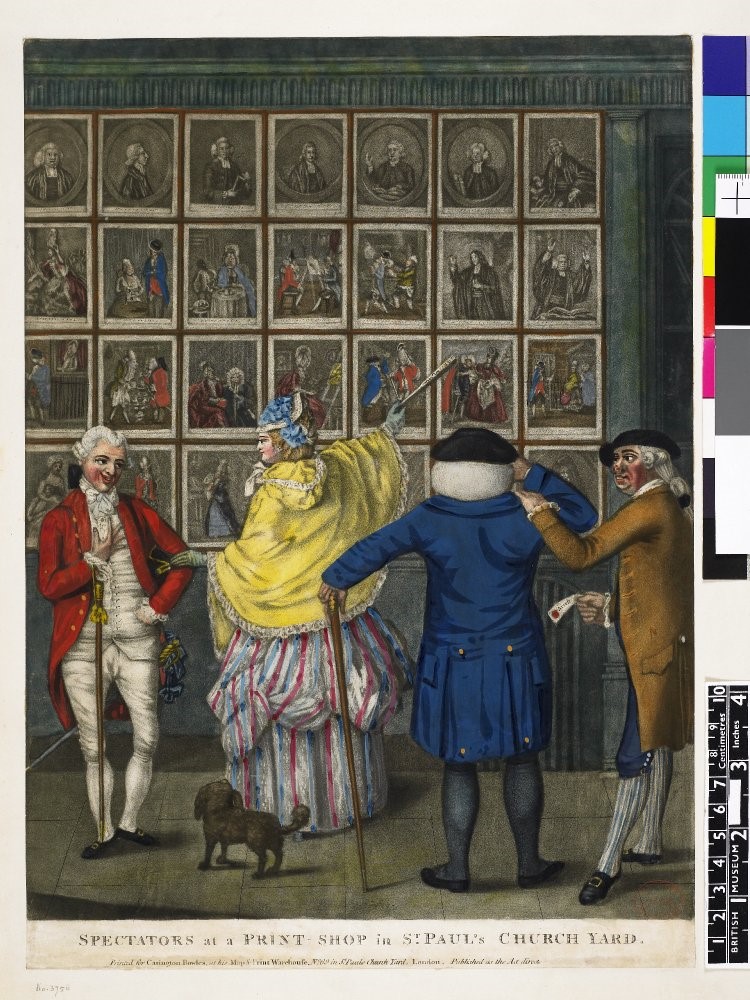 [6] “Printed for Carington Bowles, at his Map & Print Warehouse, No. 69 in St. Pauls Church Yard, London. Published as the Act directs [date erased]“ (The date June 25 1774 appears on another impression. ) The Trustees of the British Museum: <https://www.britishmuseum.org/research/collection_online/collection_object_details.aspx?objectId=1601655&partId=1&searchText=Spectators+Print-Shop&page=1>
