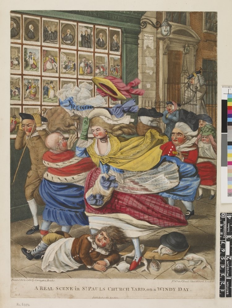 《聖保羅教堂庭院颳大風的一天實景》(A real scene in St Pauls Church Yard, on a windy day) , published by Carington Bowles, 1728-1784. Print on paper, 35x25cm. British Museum, London. 圖版來源:The Trustees of the British Museum。