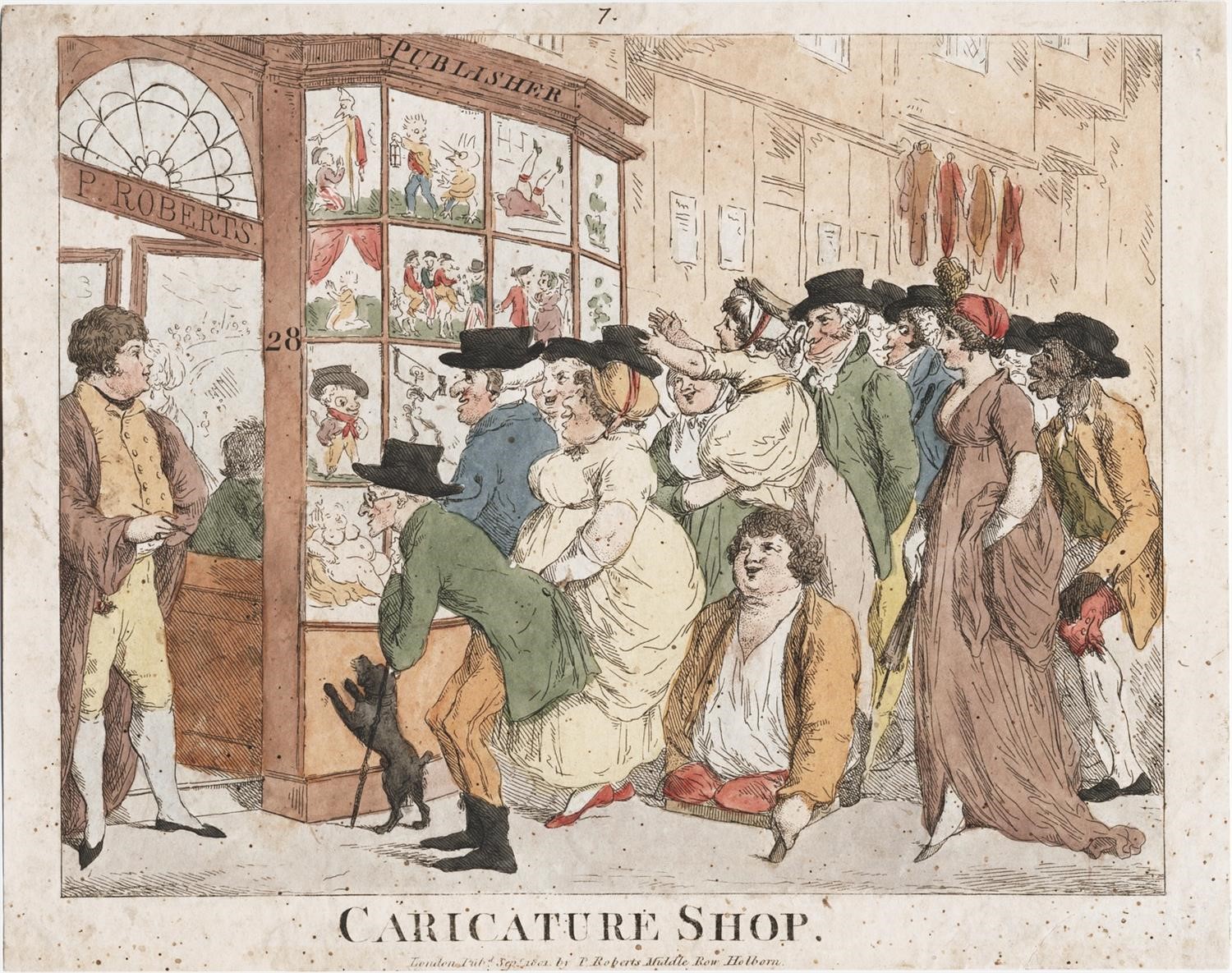 這張題名《漫畫店》的手工上色蝕刻版畫,沒有刻版者的名字,但有出版商名羅伯茲(Piercy Roberts)與出版年1801。羅伯茲於1801與1806年間在倫敦市中心熱鬧的霍爾本大街上(28 Middle Row, Holborn)開店,畫中店門上的「28」、「P. Roberts」、「Publisher」字樣,清楚顯示這是為他版畫店所做的廣告。店外同樣擠滿爭看櫥窗的觀眾,包括拄杖佝僂的老者、燕瘦環肥的貴婦、缺腿的殘障人士、黑人、被抱在手上的小孩,連小狗都爬著牆看。而門口面對觀眾站著的,無疑便是店主羅伯茲本人了。