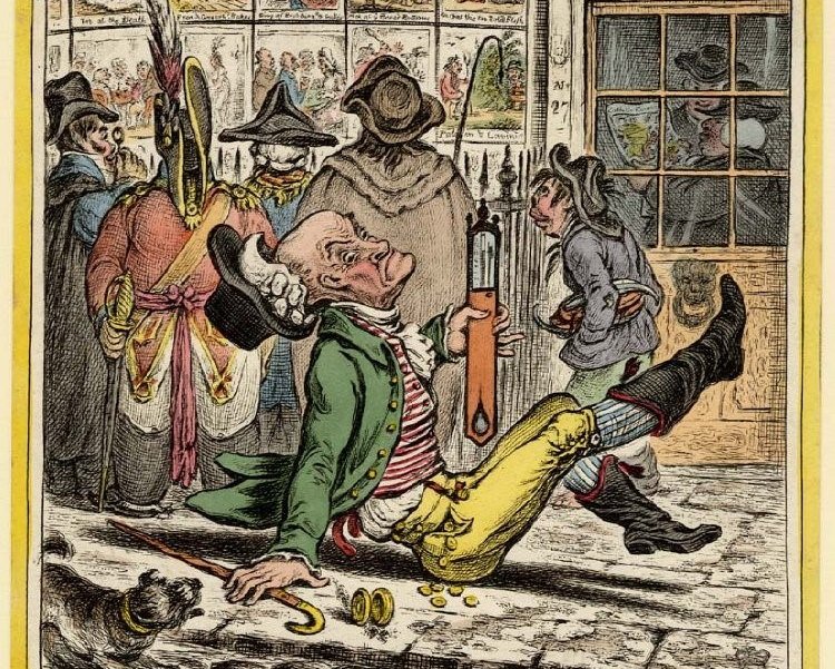 畫中櫥窗上貼的都是吉爾雷自己的名作,包括數張以拿破崙為主題的諷刺漫畫。右邊玻璃門內看得到一位酒糟鼻的牧師正和另一個人一起看一張與天主教事件有關的版畫。店外面有四個穿著類似政客、軍人、紳士、牧人的觀眾聚精會神在看著櫥窗上的版畫,全然沒有注意前景滑倒在地的男子。他的假髮和帽子往後掉落,口袋掉出錢幣和鼻煙盒,另一手卻還緊握著一支溫度計,準確地扣緊了這套版畫的氣候主題。