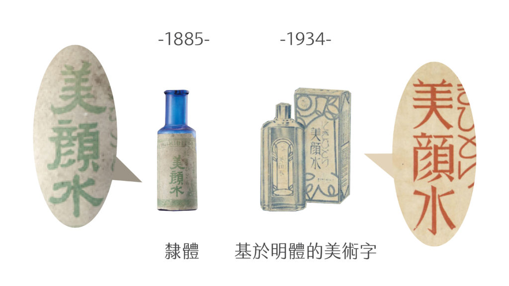 要透過字體設計做出美女形象,並不是件容易的事情。比方說銷售超過百年的明色美顏水,在 1885 及 1934 年的字體便呈現極大反差。