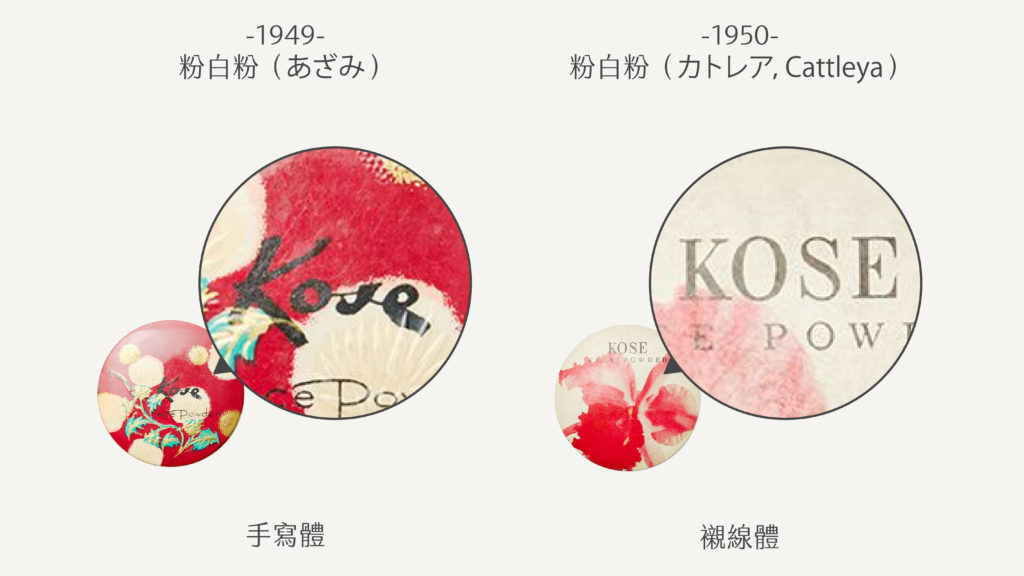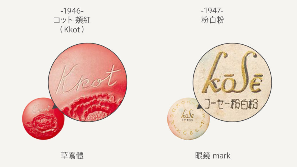 1946 年草創之初,KOSE 以手寫感草體作為企業識別面世,而且當時似乎不叫 KOSE,販售的腮紅(頰紅)採用 Kkot 之名。