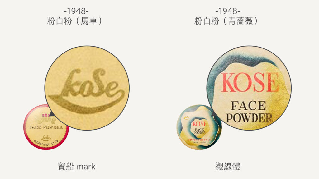 次年出品的粉白粉正式以 KOSE 作為品牌名稱 ,它有個可愛的綽號叫做「眼鏡 mark」,或許是 o、e 上方有橫線的緣故吧!這具有引導發音的用途,暗示讀音為日文唸法コーセー(ko-Se-),而不是英文的 o 拉長音、e 不發音。另外,S 的曲線設計,更與資生堂有異曲同工之妙。
