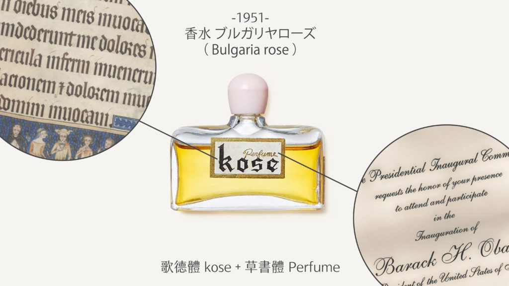 歌德體(Blackletter)是流行於 12 到 17 世紀西歐手抄書 [註 2] 的字體風格,特色是以誇張的造型詮釋華麗感,常見於聖經之中。草書體則是 18、19 世紀英國上流階級手寫書信的常見風格,其高雅、名貴的形象,讓它成為今日西洋賀卡、邀請函上的主角。KOSE 之所以如此設計,或許是想傳達玫瑰神聖且浪漫的雙重形象吧!