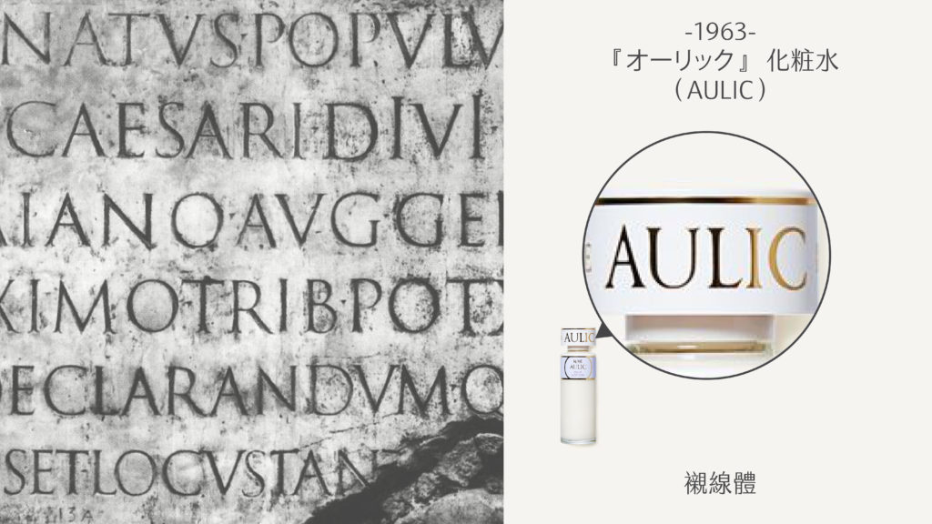 1963 年宮廷(AULIC)乳液上的字體,則帶我們進入另個世界。“AULIC” 採用 Trajan 系列的 Goudy Trajan 字型,這款字的風格源自古羅馬帝國皇帝圖拉真凱旋柱上的碑文,造型細節相當豐富,它的字母較為窄長,裝飾線微微內凹且曲度優美,因而予人高貴、精緻的感受。