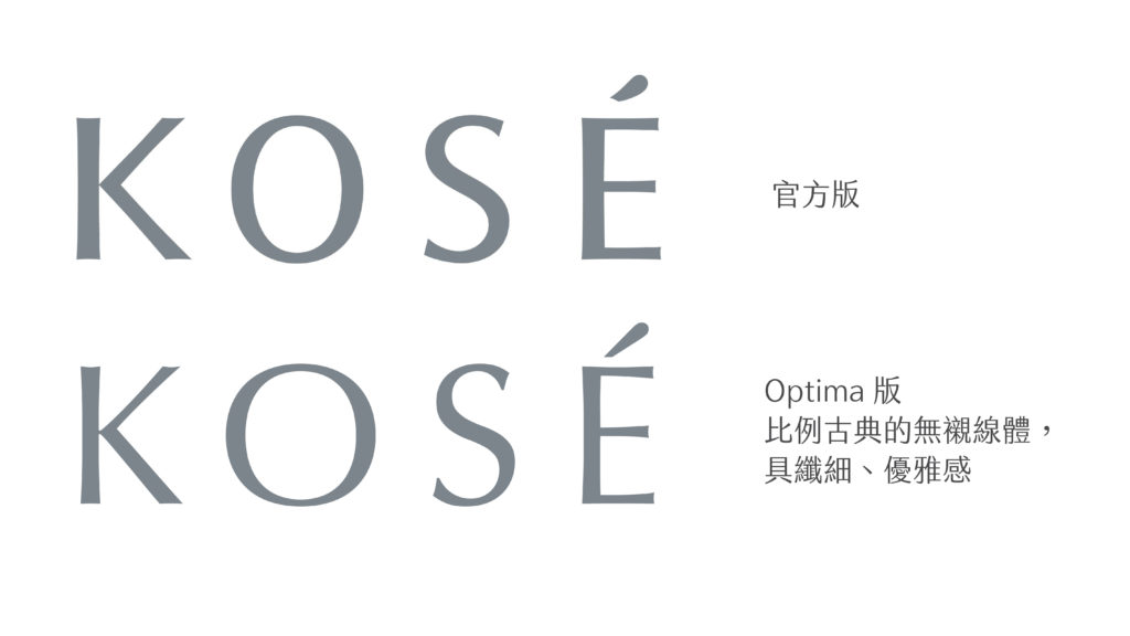 歷經了不同的 logo 嘗試,KOSE 近期停留在無襯線體。這款設計近於 Optima 字型,由於結構與比例相當古典,明明去除了襯線,卻能帶給人如襯線體般的纖細、雅緻印象,因而能維持住先前 logo 的羅馬感。