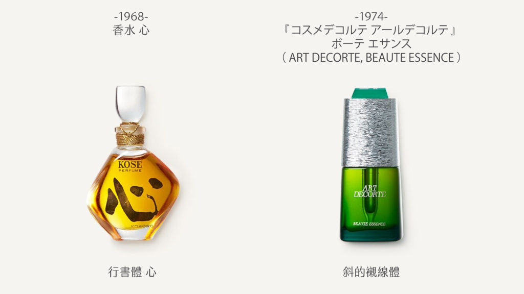 字體設計之於化妝品,除了顧慮使用者,也得考量產品特性。1968 年 KOSE 出品一系列和風香水,分別是心、歓及調。這時他們選擇直接訴諸大和意象,「心」就像率性寫下的毛筆行書,在繼承筆法之餘又有自由、恣意的味道,也符合 20 世紀以來日本書法的發展趨勢。