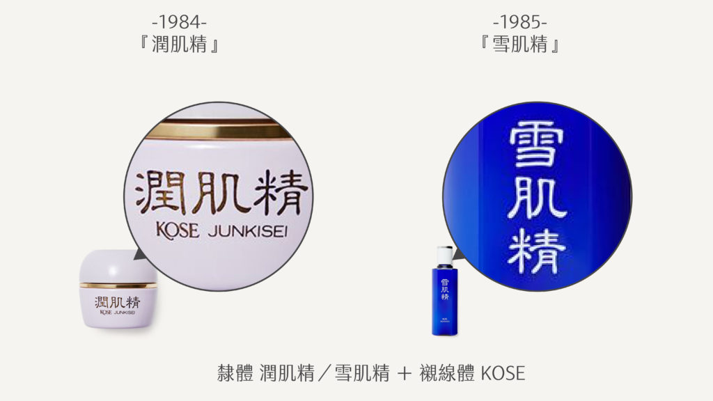 相對而言,1984 年的潤肌精與次年的雪肌精更能喚起「漢方」感。這主要靠字體設計達成,KOSE 選用風行於漢代的隸體,並將架構自扁平調整為方正,以符合近代人較喜歡瘦、高結體的審美取向。