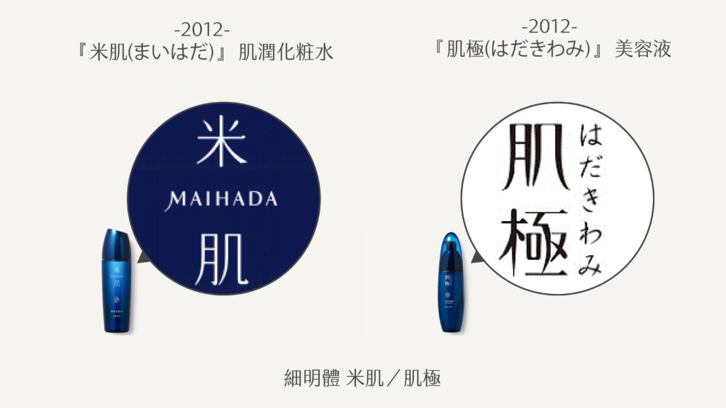 與之對比的組合,是 2012 年出品的「米肌」與「肌極」系列。KOSE 選用簡練的細明體作為品牌識別,從隸體轉變為明體,在保留典雅的優美感之餘,結構變得修長、線條也更為俐落。「肌極」的字體尤其新穎,豎筆由粗到細,取消尾部的勾,讓字體像是飄起來一樣,有種初出社會、不穩定的感覺。