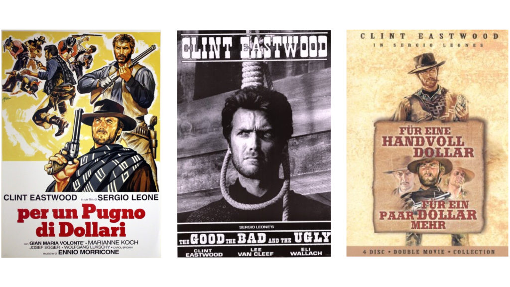 圖片來源:左到右依序為荒野大鏢客(1964)、黃昏三鏢客(1966)、黃昏雙鏢客(1965)