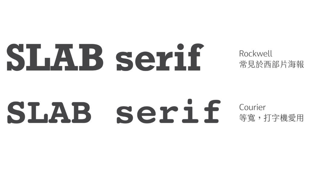 顧名思義,粗襯線體的特徵就是加粗、加厚的襯線設計。原先依附在筆畫起收端點的細微襯線,因而變成頗具量感的塊狀造型。粗襯線體起源於 19 世紀初期的歐洲,因為設計相當大膽且引人注目,所以常被廣告商用於海報設計。Mac 內建的 Courier 以及 Rockwell 字型,都是著名的字型範例。