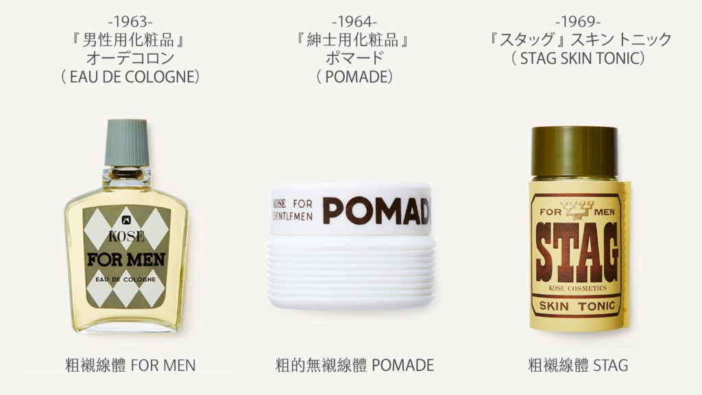 這種男性意象的強調,在 1969 年的スタッグ(STAG)化妝水又更加深化。STAG 是成年雄鹿的意思,牠的鹿角重達 17 公斤,除了能在求偶時一爭高下,平常也有防禦用途。KOSE 以粗襯線體寫出 STAG 一詞,並放了鹿角的圖像,營造雄強、威武形象的企圖不言而喻。