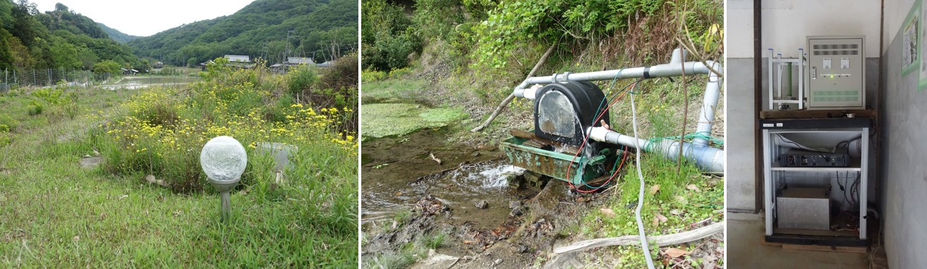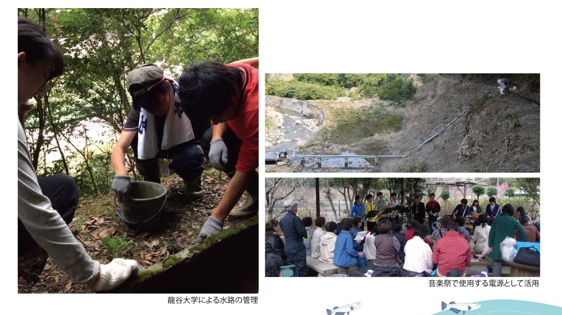 接待我們的竹原町內會太田明廣會長,帶著我們緣溪而上,說明當地目前有龍谷大學、九州大學、早稻田大學、兵庫縣立大學協助聚落發展事務。其中,在洲本市打造淡路島成為「環境未來島」的構想下,加上居民們的極力爭取,龍谷大學與九州大學從2013年開始,就投入千草竹原聚落的小水力發電設施的基礎調查工作。2014年,利用竹原地區的灌溉水圳、溪流及地形高低落差特性,兩間大學的師生協助社區居民清除水道淤塞、修繕水圳,架設小型水力發電機組及儲電設備。發電機組的開關及儲電設備均設置在鄰近的民宅倉庫中。