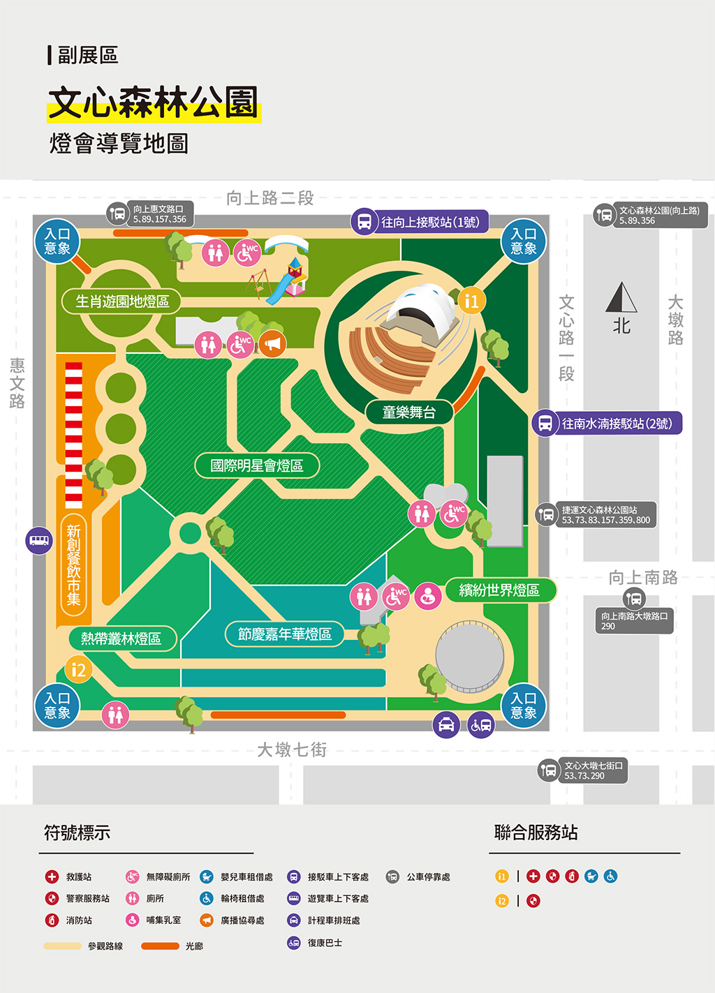 而燈會的副展區則在108年12月21日便於在台中文心森林公園開跑,以「童趣樂園」為主題,規劃生肖遊園地、熱帶叢林、節慶嘉年華、繽紛世界、國際明星會等五大燈區,搭配節慶假日童樂舞台的精采表演,打造出最夢幻、最驚奇的大型童趣樂園!