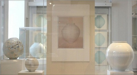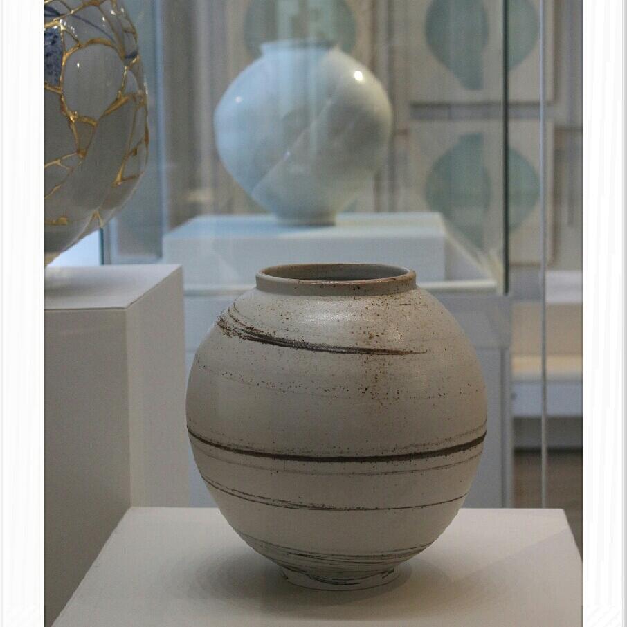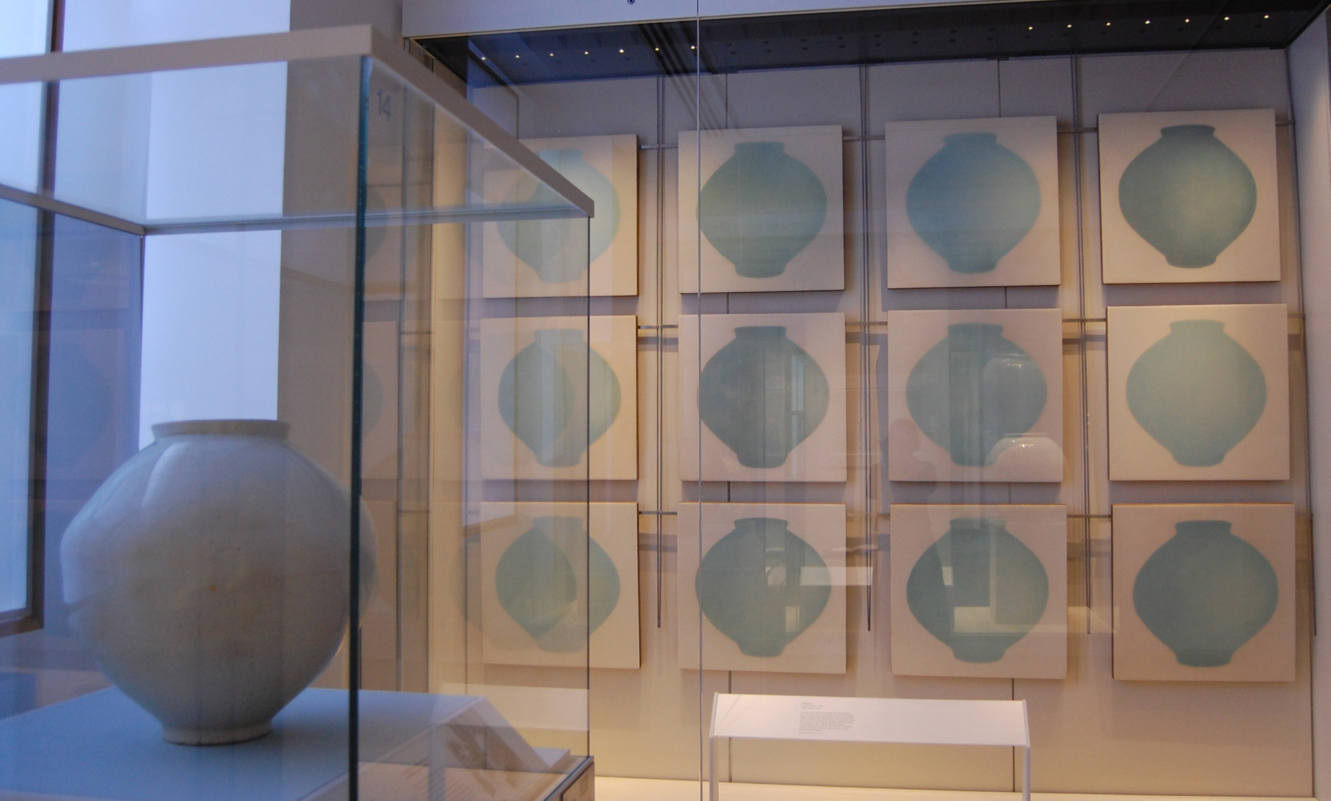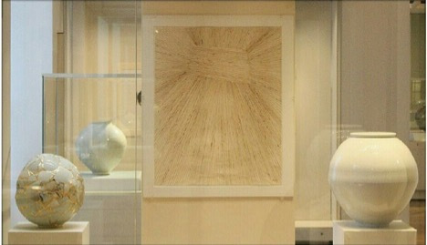 EH: 朝鮮時代韓國瓷器美學的代表作《月瓶》(moon jar),代表兩位陶瓷藝術家對韓國瓷器的熱愛:1935年英國人Bernard Leach 首次與日本人柳宗悅一起到韓國旅行時,偶然機會中買下來的。《月瓶》的純淨美學特色很符合日本的審美趣味,類似的作品大阪陶瓷博物館也有收藏。日本因為茶道文化盛行之故,很早就開始收藏韓國陶瓷,16世紀豐臣秀吉入侵韓國雖沒有成功,但擄獲一批瓷器工匠戰俘。當時韓國的瓷器製作技術比日本進步很多,透過這批工匠身負的韓國瓷器製作手法,提高日本陶瓷製作水準。20世紀上半、由柳宗悅提倡的日本民藝運動,便是受到韓國陶瓷美學觀念影響,追求自然、不做作、不對稱、不完美但貼近生活的簡單美學。在這件作品中我們可以看到柳宗悅的美學思想:整件作品釉彩不均勻,表現一種不完美的美學特色,此外《月瓶》顏色全白、素面、無裝飾的低調美學風格,與當時韓國舉國上下都信奉儒家以及朝鮮末期韓國學者的新儒家思想有關:「白瓷的美學在於它絕對的美與至高的純淨,樸實無華。」展廳中安排繪畫、陶瓷等其他作品與之呼應,並透過色彩、光線、不同藝術品所呈現的質感變化以及觀者與《月瓶》遠近關係的改變,欣賞《月瓶》之美,看似簡單,實則趣味無窮。
