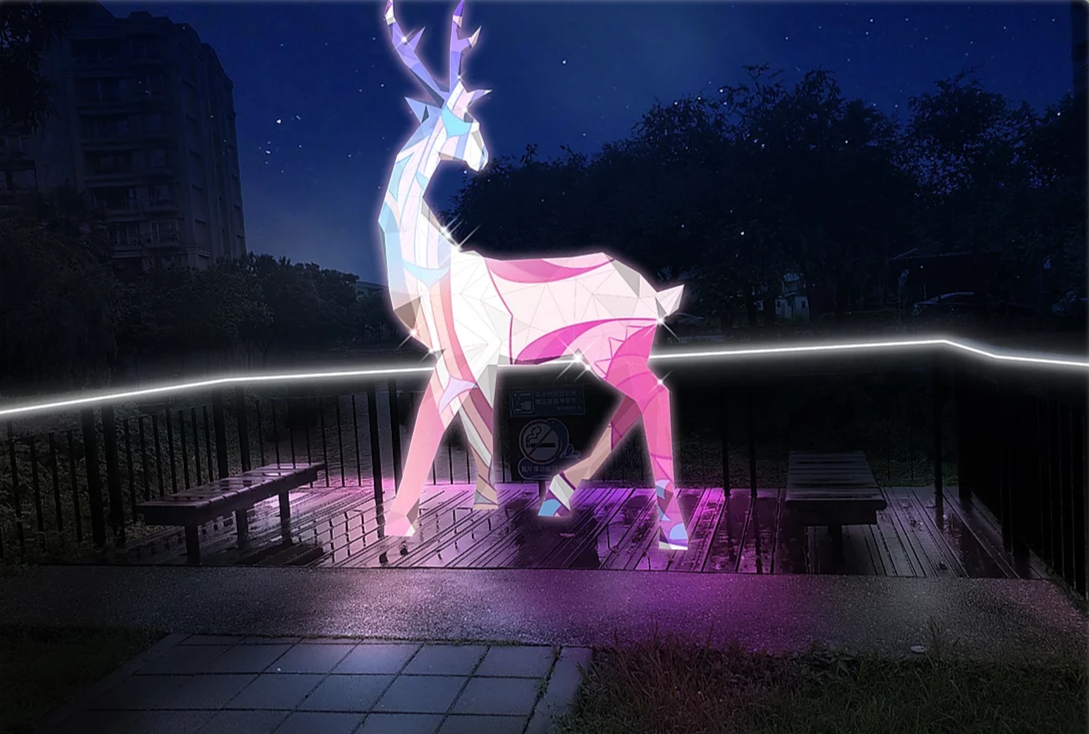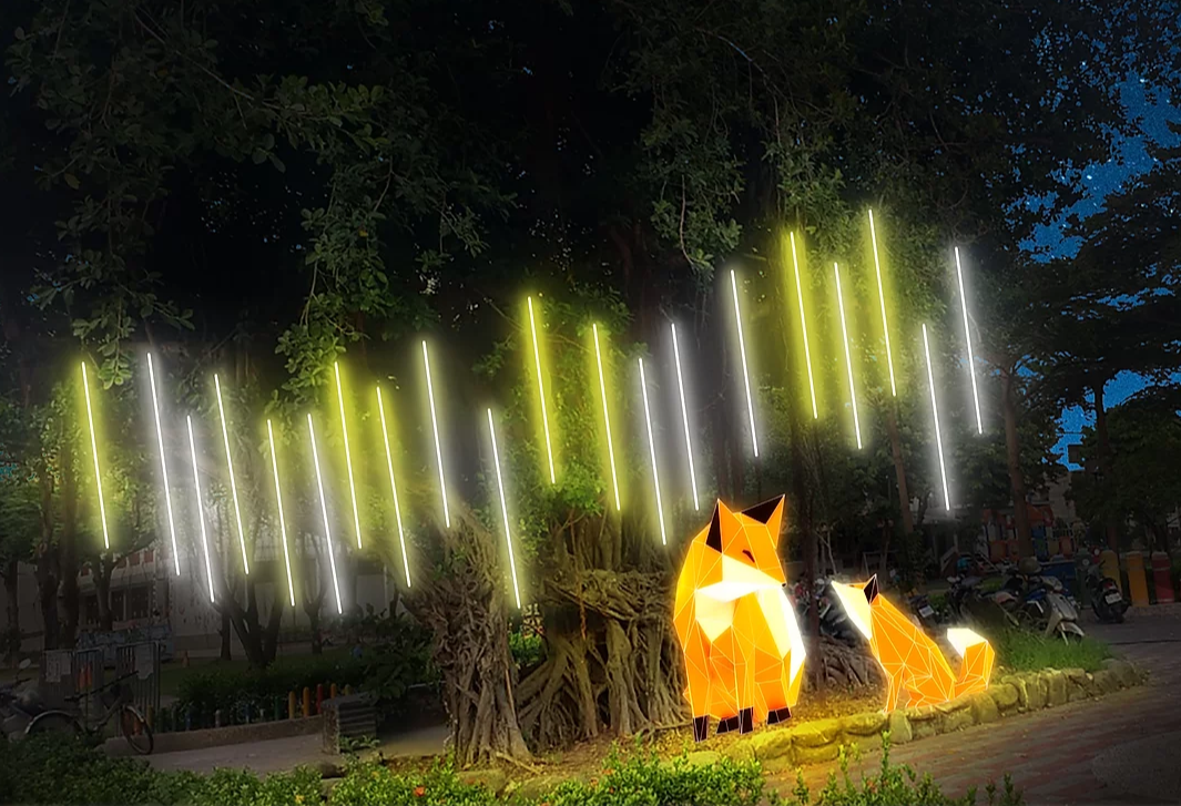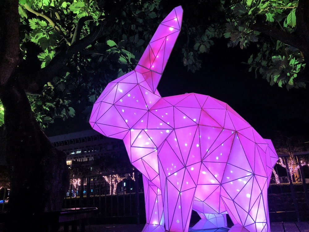 此次燈節以「森林動物派對」為主題,劃分出4大主題燈區,每一個動物身上皆以幾何圖形設計為主,搭配不同的燈光顏色,獨特又吸睛,讓整條萬年溪畔添上熱鬧活潑氛圍。