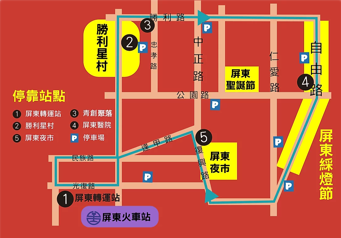 接駁車(單向環狀線)資訊:全票收費10元,停靠屏東轉運站、勝利星村、青創園區、屏東醫院、屏東夜市等5個點,得於屏東醫院下車。