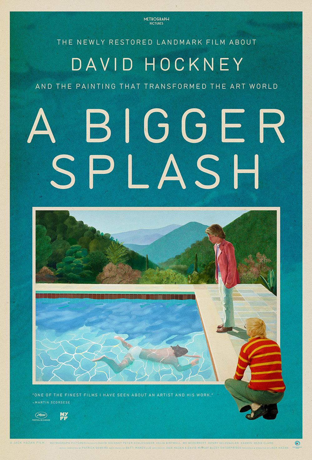 這張海報設計其實是霍克尼偶然把兩張無關的照片放在工作是地板而激發出的靈感─一張是在水中游泳的人,另一張是凝視地上的男子;為了結合這兩張構圖,他拍攝了數百張參考照才終於定稿。
