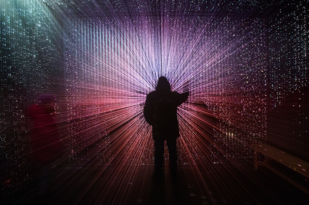 千田泰広的〈崩世光景〉(Brocken)宛如蜂炮場景,為觀眾帶來不同的聲光震撼;布羅肯奇景是一種自然的光學現象,當觀測者背向太陽產生的陰影,會投射在雲層表面上被放大的巨大影像。這項作品如同神秘的光影效果,只要觀賞者站在作品前面,影子就會被投射在霧雲裡,周圍的彩虹發光燈飾,彷彿太陽直接在身後,看見如散狀被破壞的彩色光芒形成的光環,就像蜂炮一樣由四面八發而來,相當壯觀。