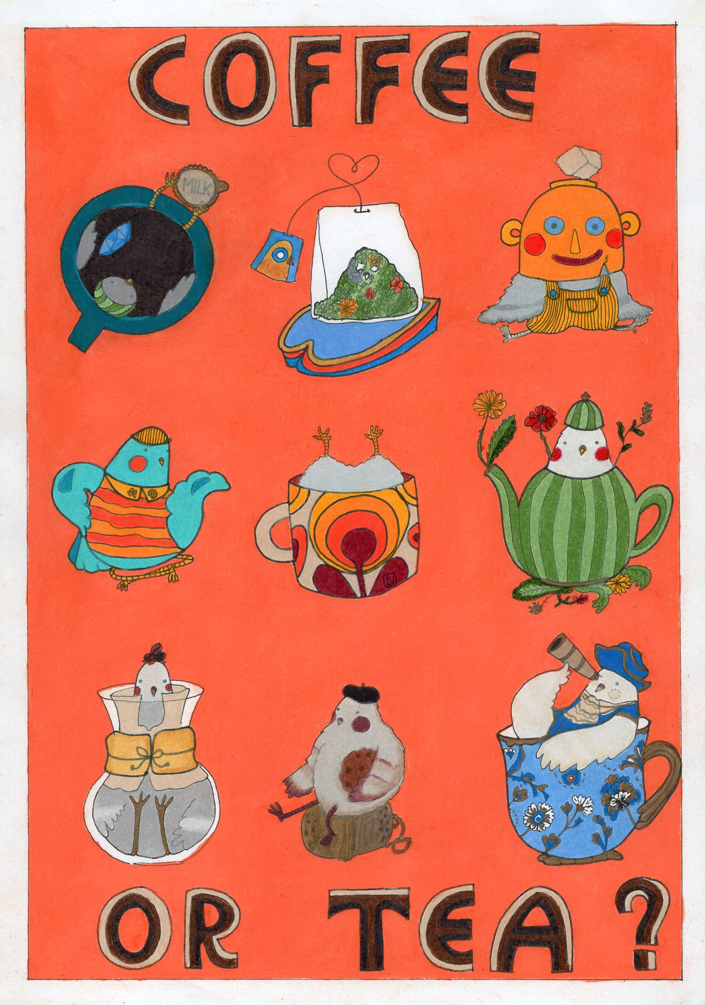 咖啡或茶是為了向李夫人的鴿子咖啡廳的開幕致意,這也是我來這裡的原因。在我逗留期間,我做了一些涉及我的鴿子和咖啡廳的塗鴉。回到巴黎後,我意識到這些獨立的圖畫在海報上重新組合起來會顯得很棒。最終的結果有一個嬉戲和樂趣的感覺,以及一個非常70年代的氛圍。