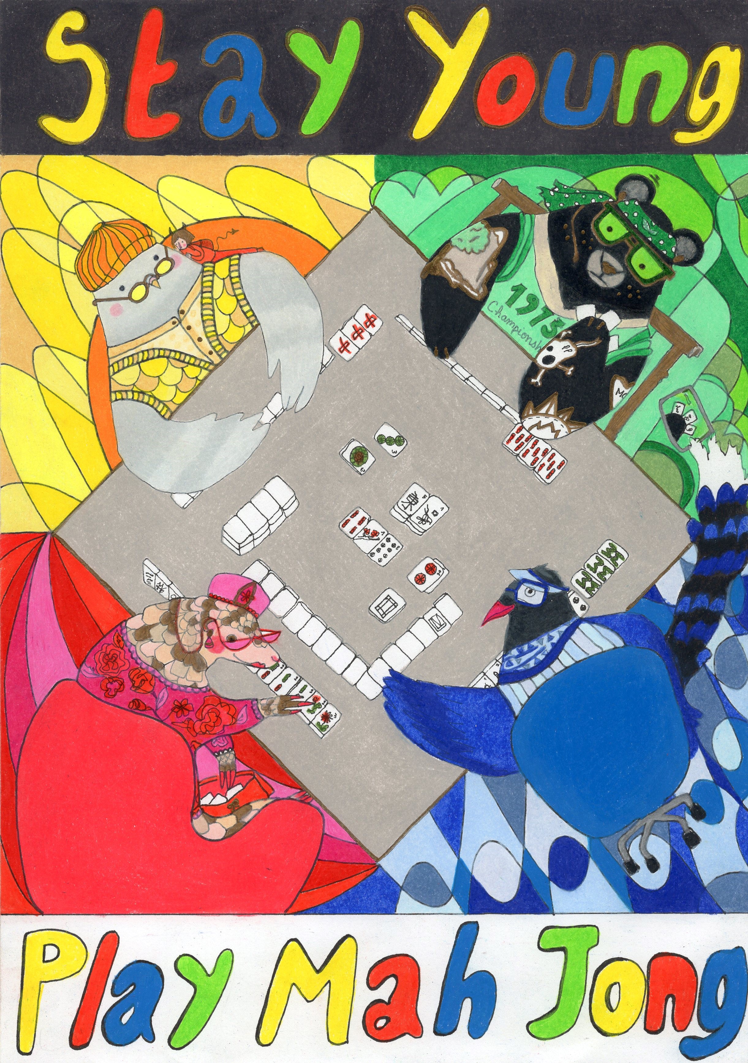 Stay Young, Play Mah-Jong was inspired by several things : old people who are young at heart, playfulness with a tiny bit of cheating (because it's more fun that way), Coolidge's Dogs Playing Poker painting and taiwanese emblematic animals. Aside from the ordinary but remarkable pigeon, I depicted the mysterious and strong Formosan black bear, the friendly and cackling taiwanese blue magpie and the sweet and nocturnal pangolin. As for the game, I replaced poker with Mah-Jong, a game that has always intrigued me but that I have never played. Please forgive me any error in the game's depiction.