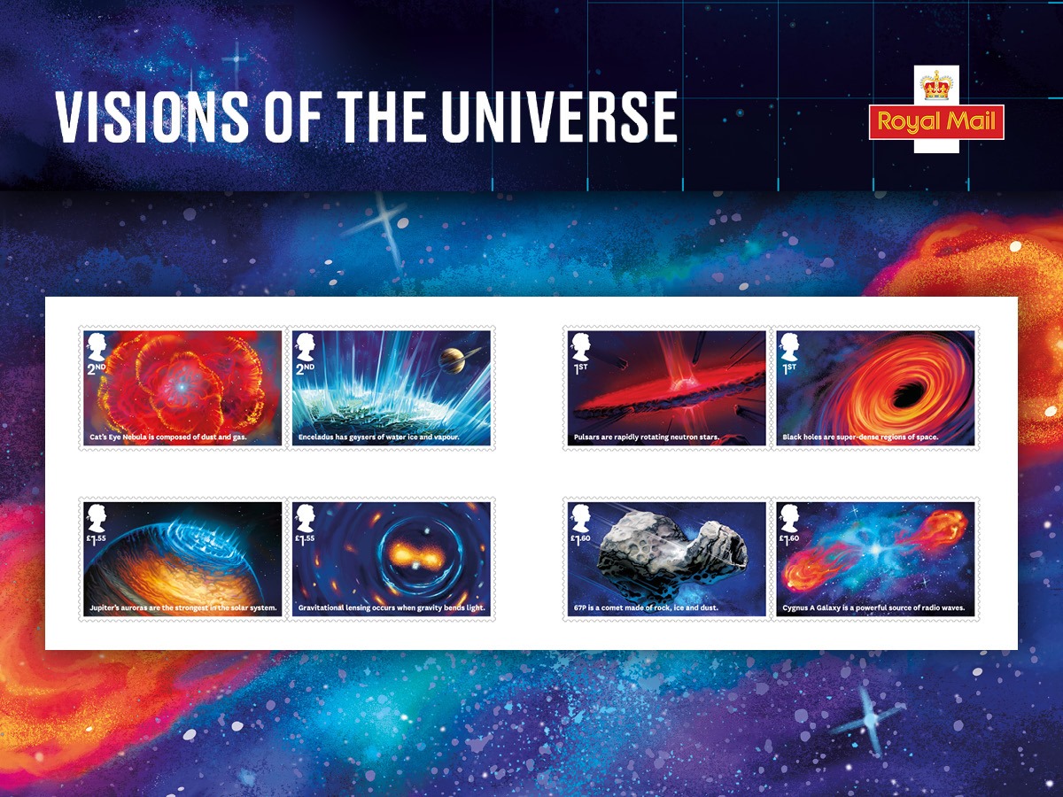 這套名為《Visions of the Universe》的郵票,共有八枚不同的郵票,由Robert Ball繪製平面插圖,記錄下英國的天文學家和天體物理學家過去所發現的現象或研究的成果,包括黑洞、脈衝星、彗星和天鵝座A等。