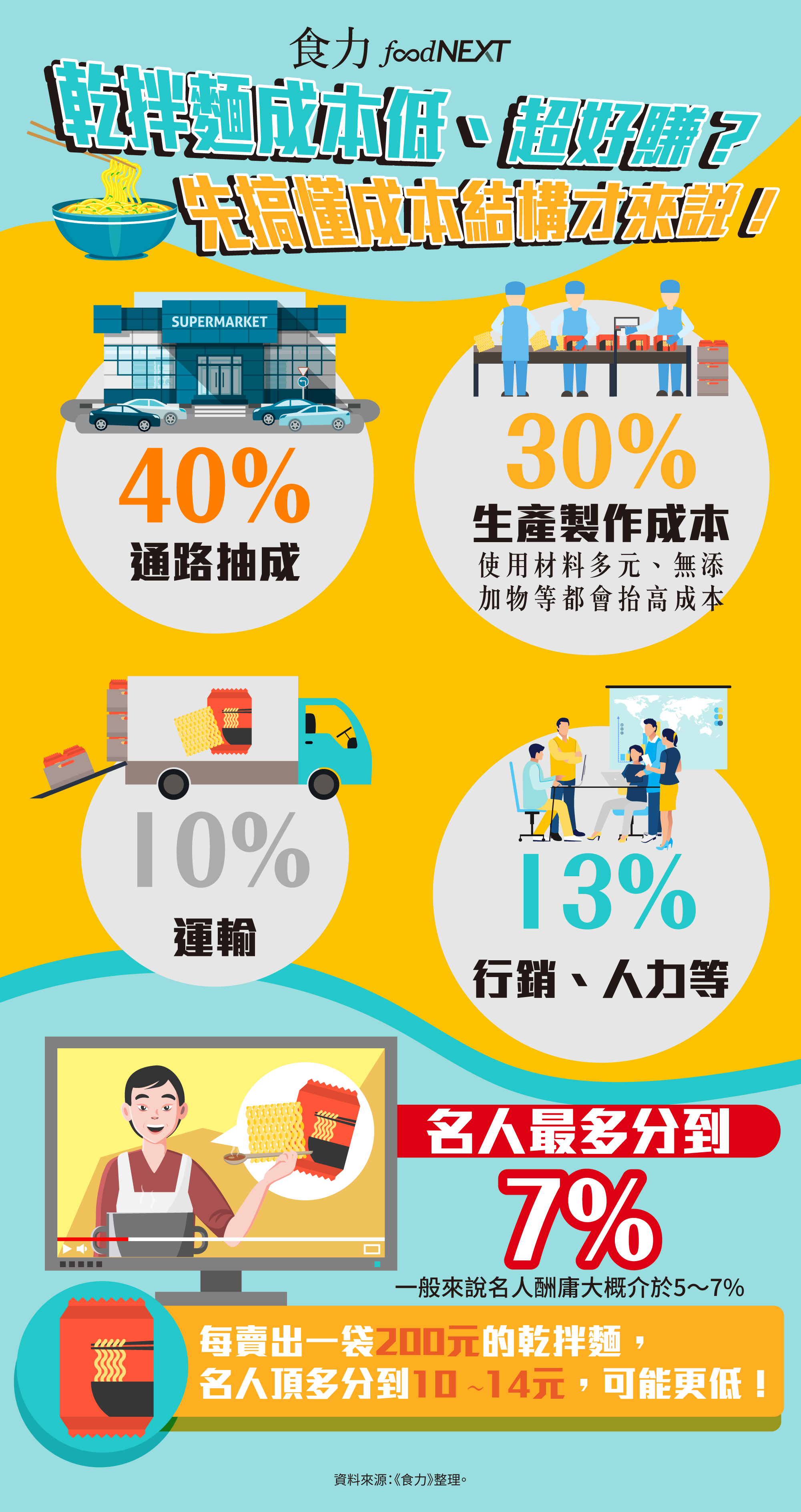但實際上,名人投資真的很好賺嗎?其實未必!唐源駿指出,賣出一包乾拌麵,當中30%是麵體、醬料等的成本、40%由通路抽成、10%用於運輸,最後20%還要分擔在行銷、廣告、人力、客服、藝人酬庸等各方面,名人頂多分到5~7%,如果以一袋200元為計,每賣出一袋,名人頂多分到10~14元,並不是如網路所說都是暴利。