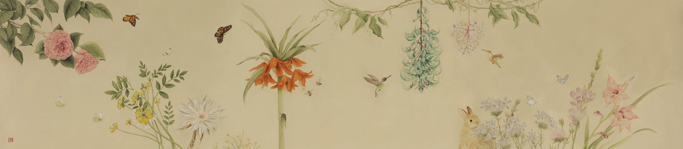 2020於Bluerider ART 第三次個展《田野珍稀圖》中,將再次以純熟的技藝結合超現實的美學觀點,追溯狩獵、採集的根本,探究人類的佔有欲。《田野珍稀圖》從宋代《百花圖卷》中得到靈感,《百花圖卷》雖描繪花卉,對於宋代當時的社會環境、文化思想卻有象徵性地位,而《田野珍稀圖》則紀錄數十種瀕臨絕種的花卉,這些美麗的物種因為人類大量採摘或氣候變遷瀕臨絕種,未來也許將不復存在。